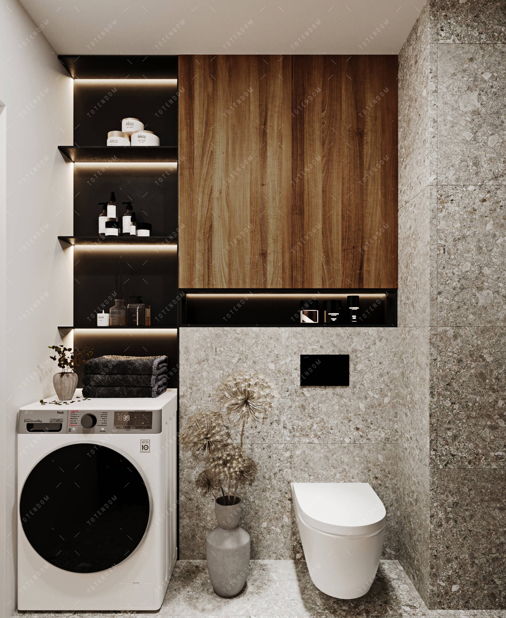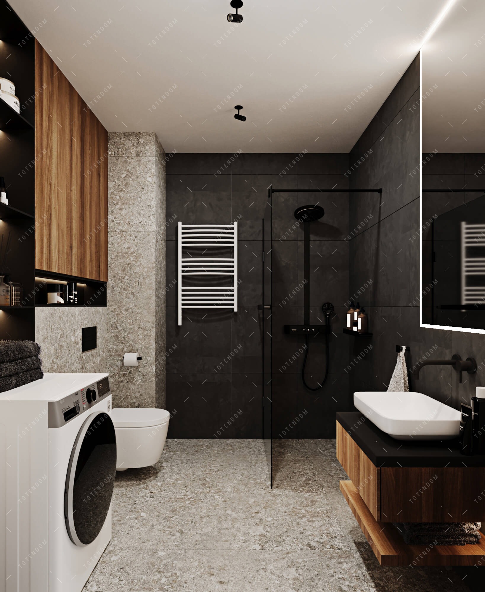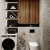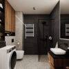 Ta elegancka łazienka emanuje nowoczesnym urokiem. Podświetlane półki tworzą subtelne świetlne akcenty, nadając wnętrzu wyjątkowego nastroju. Kompaktowa kabina typu walk-in zapewnia swobodę i funkcjonalność podczas korzystania z prysznica. Ciemne kolory dominują w aranżacji, nadając wnętrzu elegancji i wyrafinowania.