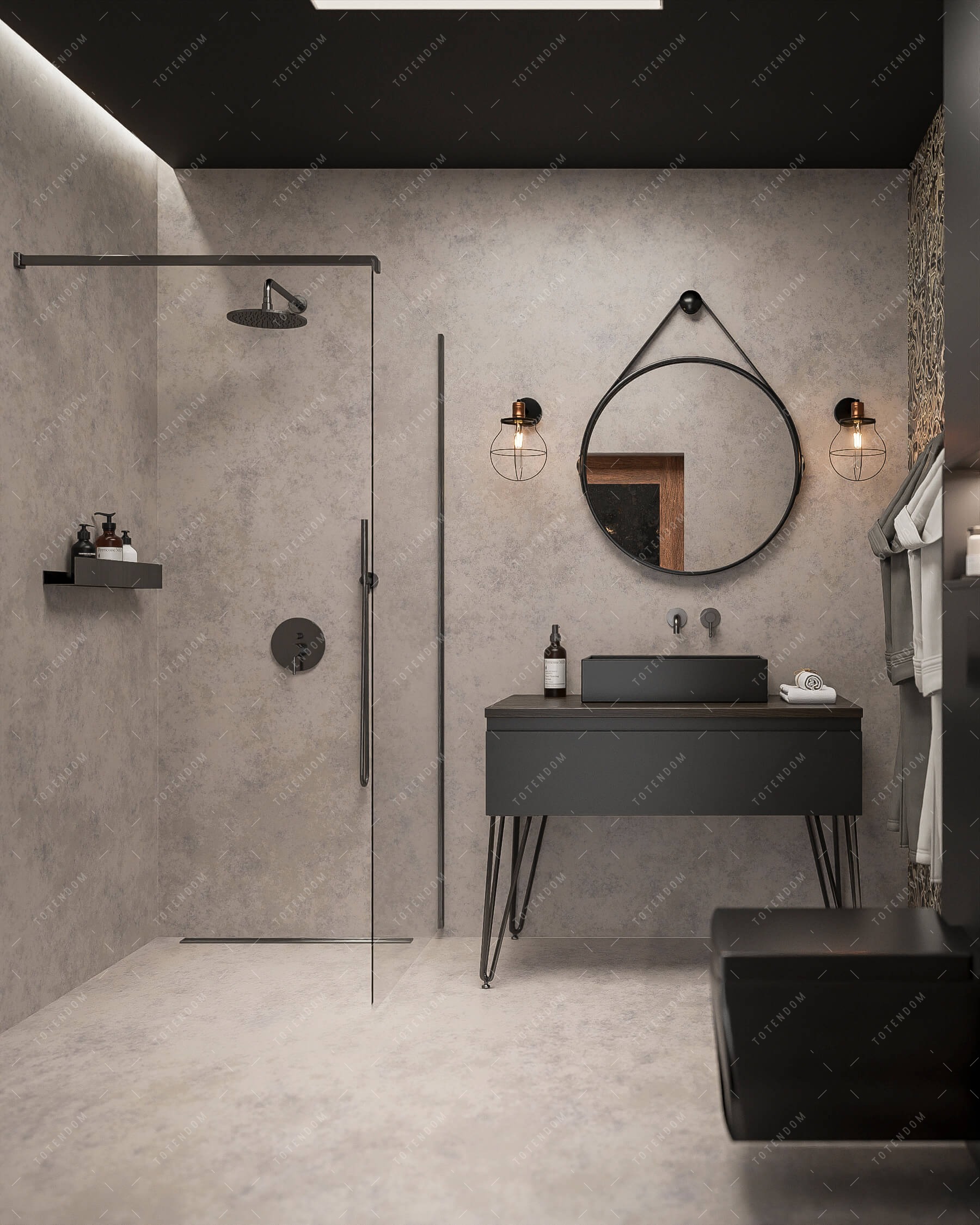 Ta nowoczesna łazienka emanuje elegancją dzięki dominacji czerni. Kompaktowa kabina typu walk-in i wiszące WC optymalizują przestrzeń. Intrygująca tapeta dodaje indywidualności, a wieszak na ścianie zapewnia praktyczne przechowywanie. Okrągłe lustro uzupełnia nowoczesny design. To miejsce, gdzie czerń, wyjątkowe detale i praktyczne rozwiązania harmonijnie współgrają, tworząc nowoczesną łazienkę o eleganckim charakterze.