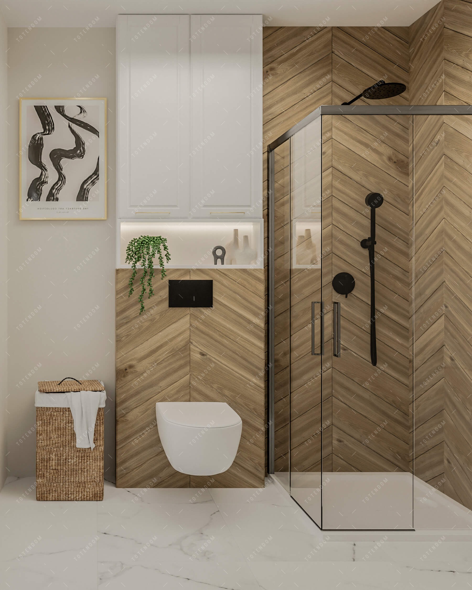 Ta jasna łazienka emanuje przyjemną atmosferą i naturalnym urokiem dzięki drewnianym elementom, które dodają ciepła i stylu. Duże lustro staje się centralnym punktem, odbijając światło i optycznie powiększając przestrzeń. Kompaktowa kabina prysznicowa zapewnia wygodę i funkcjonalność, a wiszące WC optymalizuje miejsce, tworząc przestrzeń i ułatwiając utrzymanie czystości.