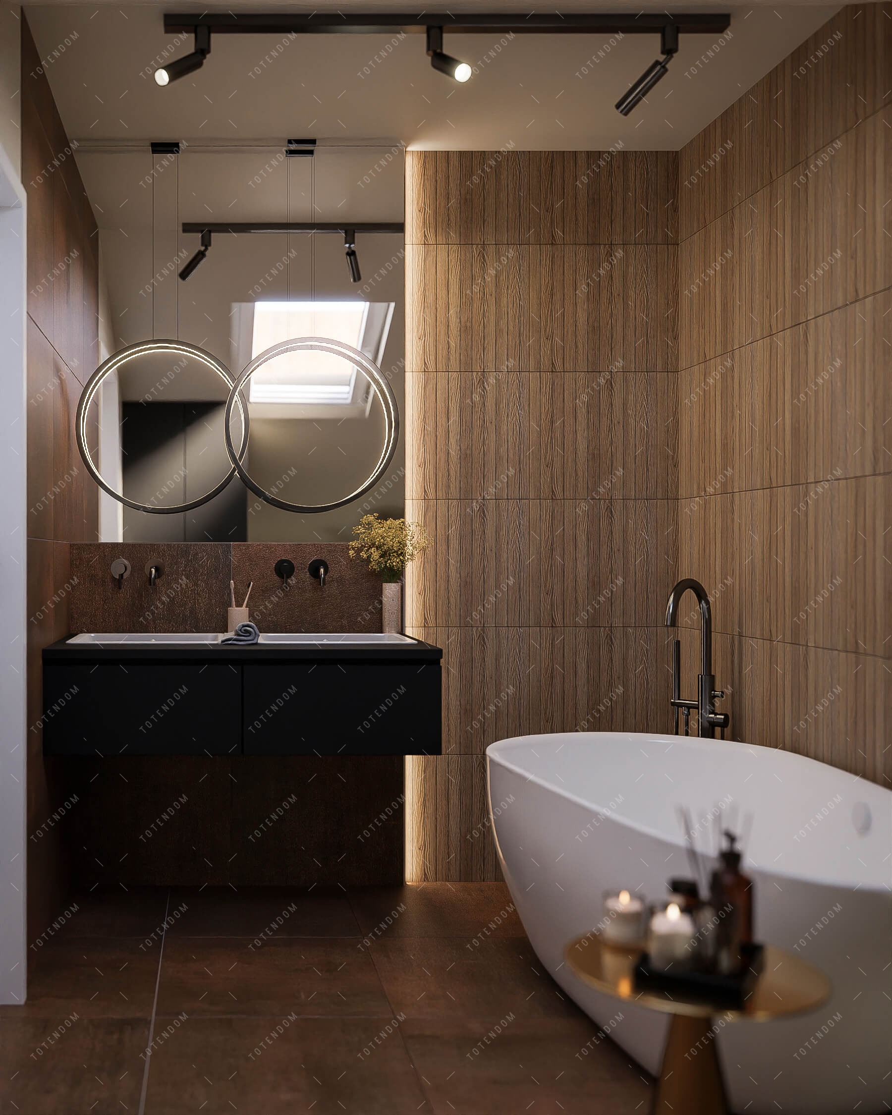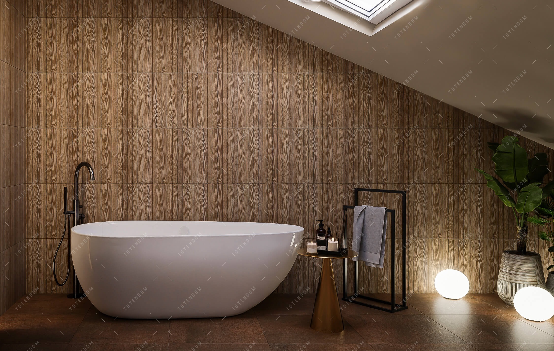 Ta klimatyczna łazienka emanuje przyjemnym nastrojem i harmonią. Wolnostojąca wanna stanowi centralny punkt, zapewniający relaksujące chwile. Lampy na podłodze tworzą wyjątkowe oświetlenie, nadając wnętrzu magii. Kolory ziemi dominują, wprowadzając ciepło.