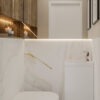 Ta mała łazienka zachwyca elegancją białych płytek z delikatnymi złotymi zdobieniami. Przeszklona kabina prysznicowa optycznie powiększa przestrzeń, a lustro dodaje funkcjonalności i stylu. Narożna umywalka doskonale wykorzystuje dostępną przestrzeń. To miejsce, gdzie elegancja spotyka praktyczność, tworząc urokliwe wnętrze małej łazienki.