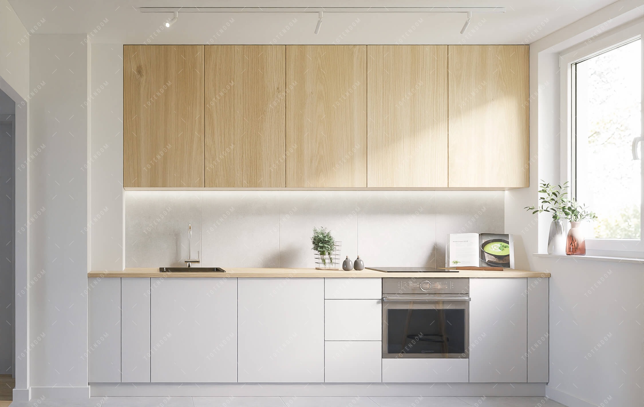 Ta kuchnia wyróżnia się minimalistycznym designem, gdzie dominuje prostota i czystość. Zabudowa kuchenna została zaprojektowana z myślą o praktycznym wykorzystaniu przestrzeni, a intensywna jasność dodaje jej przestronności i czystości.