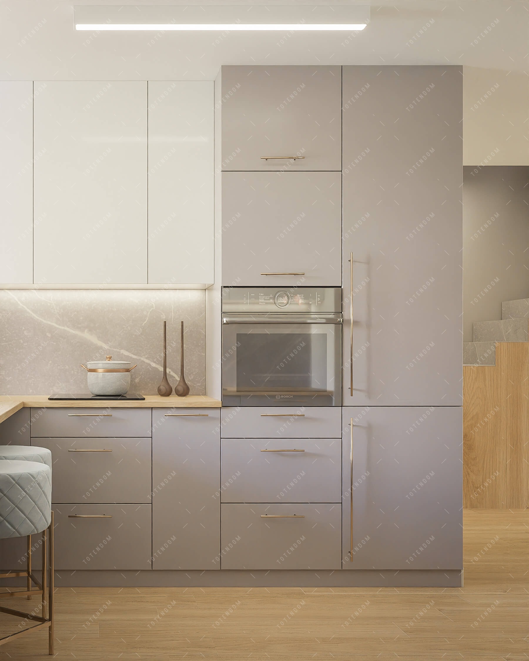Kuchnia na planie litery L z jasną podłogą i złotymi uchwytami to idealne połączenie funkcjonalności i stylu. Układ na planie litery L pozwala na optymalne wykorzystanie przestrzeni, a jasna podłoga dodaje wnętrzu przestronności i lekkości. Złote uchwyty na szafkach i szufladach dodają eleganckiego akcentu, podkreślając jednocześnie nowoczesny styl kuchni.
