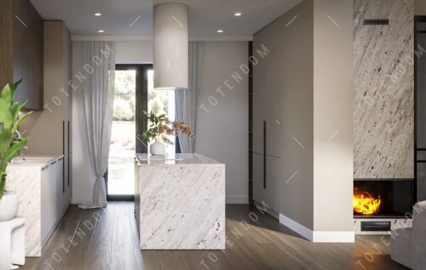 Ta kuchnia jest zaprojektowana w otwartej przestrzeni i wyposażona w wyspę kuchenną z marmurowym blatem. Wyspa kuchenna stanowi centralny punkt kuchni, który pozwala na łatwe poruszanie się po przestrzeni. Marmurowy blat wprowadza do kuchni elegancki i stylowy akcent, nadając całości luksusowy wygląd. Otwarta przestrzeń pozwala na swobodne przemieszczanie się między kuchnią a jadalnią, a jednocześnie sprzyja integracji między ludźmi, którzy spędzają czas w kuchni i w okolicy.