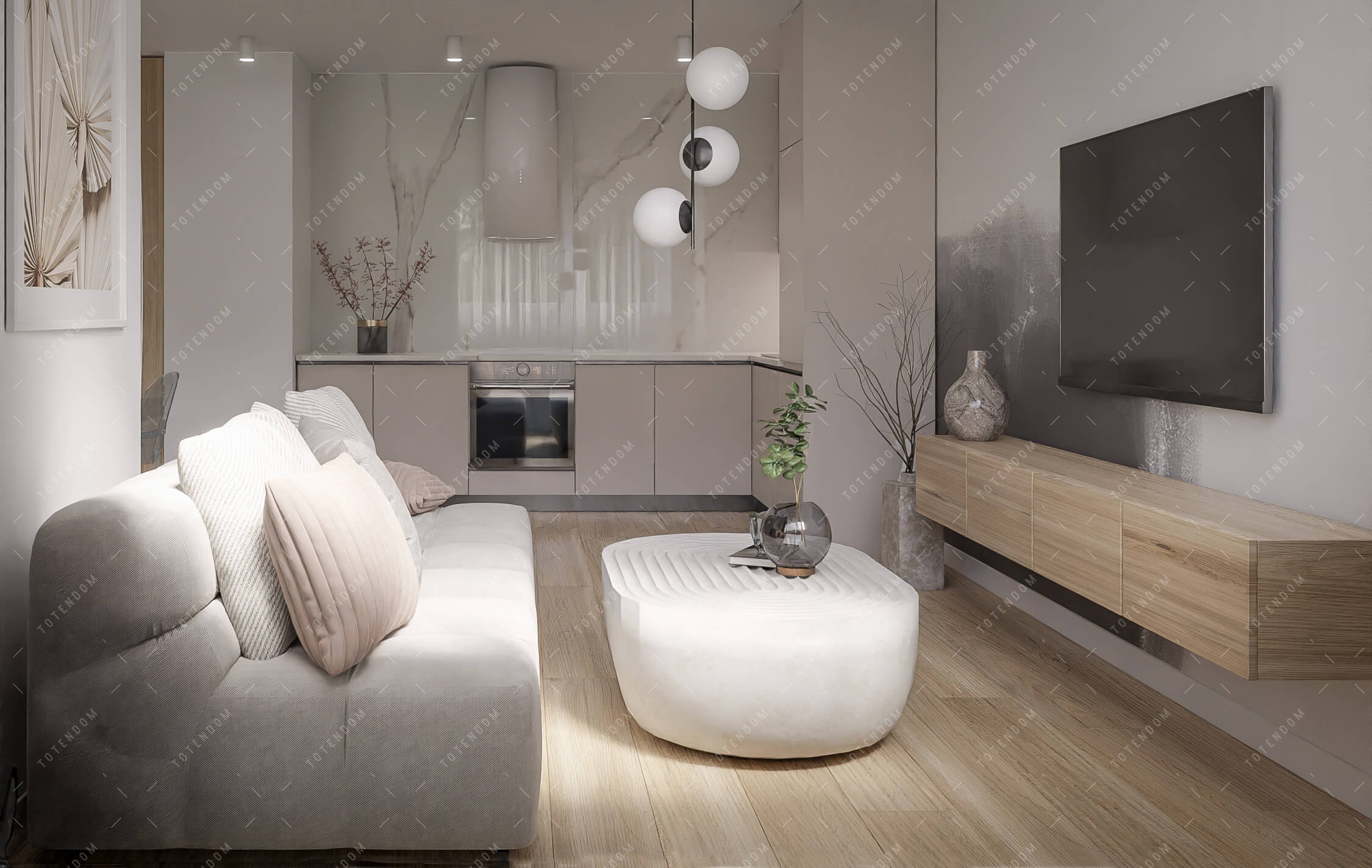 Ta kuchnia z okrągłym stołem jest idealna dla rodzin i przyjaciół, którzy lubią spotykać się w jednym miejscu. Lampy kule dodają przestrzeni elegancji, a panele podłogowe zapewniają łatwe utrzymanie czystości.