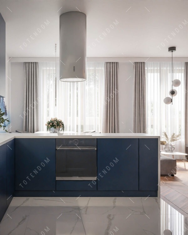 Ta jasna kuchnia składa się między innymi z półwyspu kuchennego i zabudowy kuchennej. Półwysep kuchenny stanowi serce kuchni, zapewniając miejsce do przygotowywania posiłków oraz przestrzeń do jedzenia. Zabudowa kuchenna pozwala na przechowywanie różnych narzędzi kuchennych i akcesoriów, a jasna kolorystyka ożywia całą przestrzeń kuchenną.