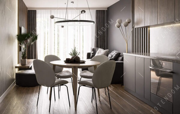 Kuchnia wyposażona jest w okrągły stół, który stanowi centralny punkt jadalni. Lampy kule tworzą miękkie i ciepłe światło, a panele podłogowe są łatwe do czyszczenia i odporne na uszkodzenia.