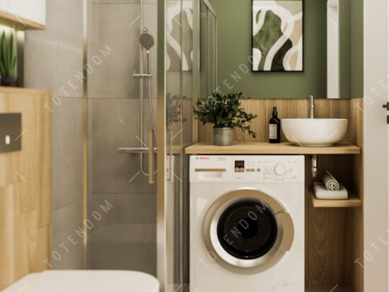 W tej nowoczesnej łazience przyciąga uwagę przeszklona kabina prysznicowa, wpuszczająca mnóstwo światła do wnętrza. Zielone ściany tworzą przyjemny kontrast, a elementy drewniane, takie jak funkcjonalny blat ze zlewem nablatowym, dodają ciepła i naturalnego uroku. Pralka umieszczona pod blatem zapewnia dyskrecję, a harmonijne połączenie wszystkich elementów sprawia, że ta łazienka jest jednocześnie stylowa i funkcjonalna.