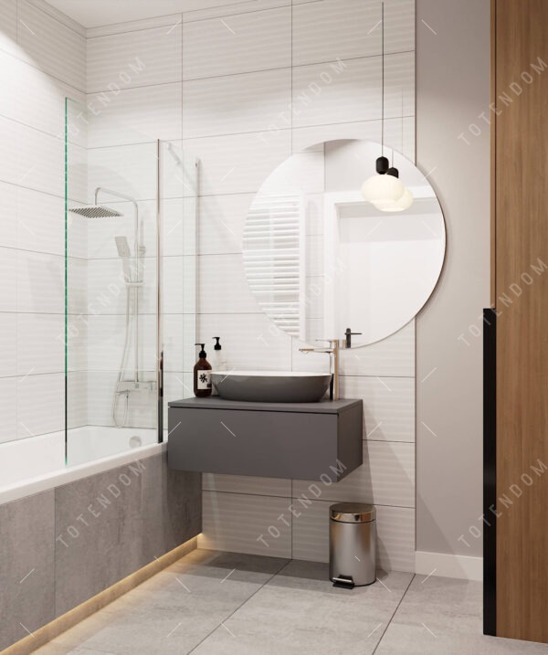 Wizualizacja łazienki, gdzie dominuje harmonijne połączenie funkcjonalności i elegancji. Wanna z prysznicem stanowi centralny punkt, zapewniając zarówno relaksujące kąpiele, jak i szybkie prysznice. Okrągłe lustro dodaje przestrzeni i dodatkowego oświetlenia. Zlew na blatowej powierzchni tworzy praktyczne miejsce do codziennej pielęgnacji. Jasne płytki na ścianach nadają wnętrzu świeżości i lekkości.