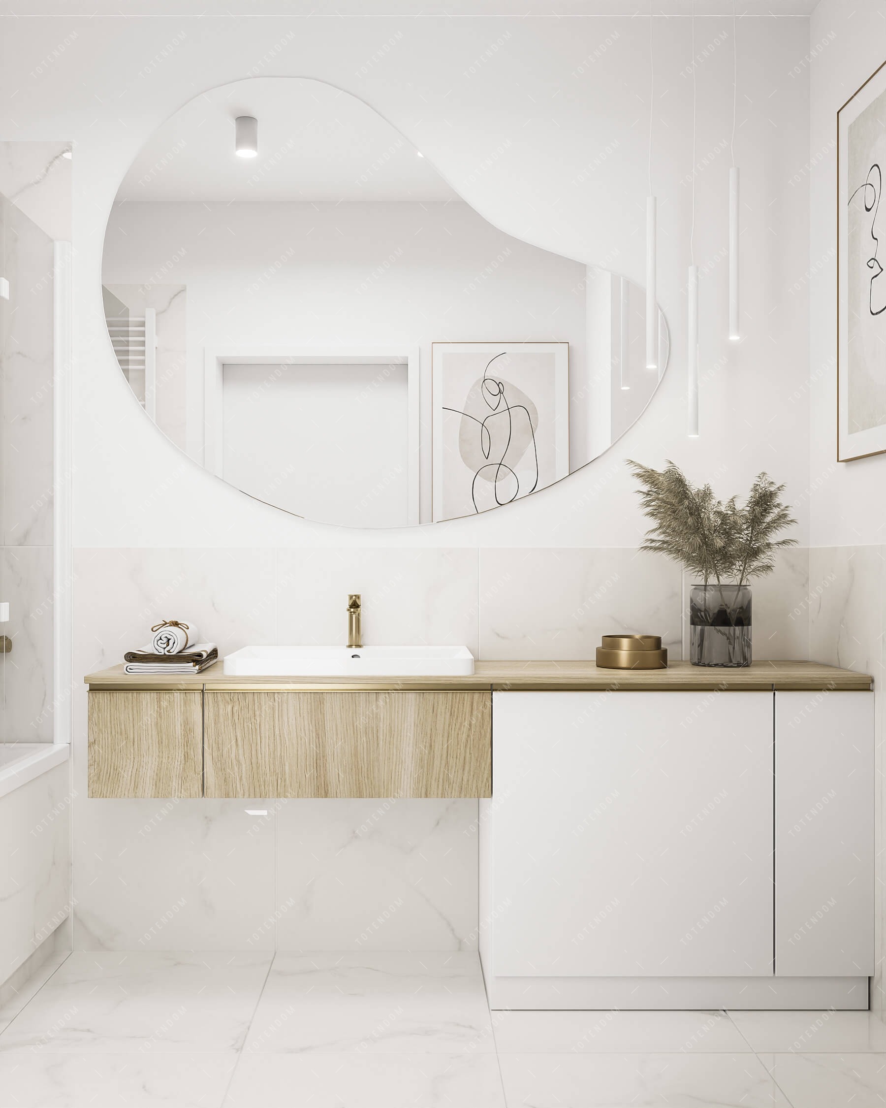 Wizualizacja łazienki, gdzie luksus spotyka się z przyjemnością. Wanna z deszczownicą stanowi centralny element, zapewniając relaksujące i orzeźwiające kąpiele. Jasne płytki nadają wnętrzu świeżości i czystej estetyki. Drewniane elementy dodają ciepła i naturalnego uroku. To łazienka emanuje harmonią, elegancją i przyjemną atmosferą, tworząc miejsce idealne do relaksu i odprężenia.