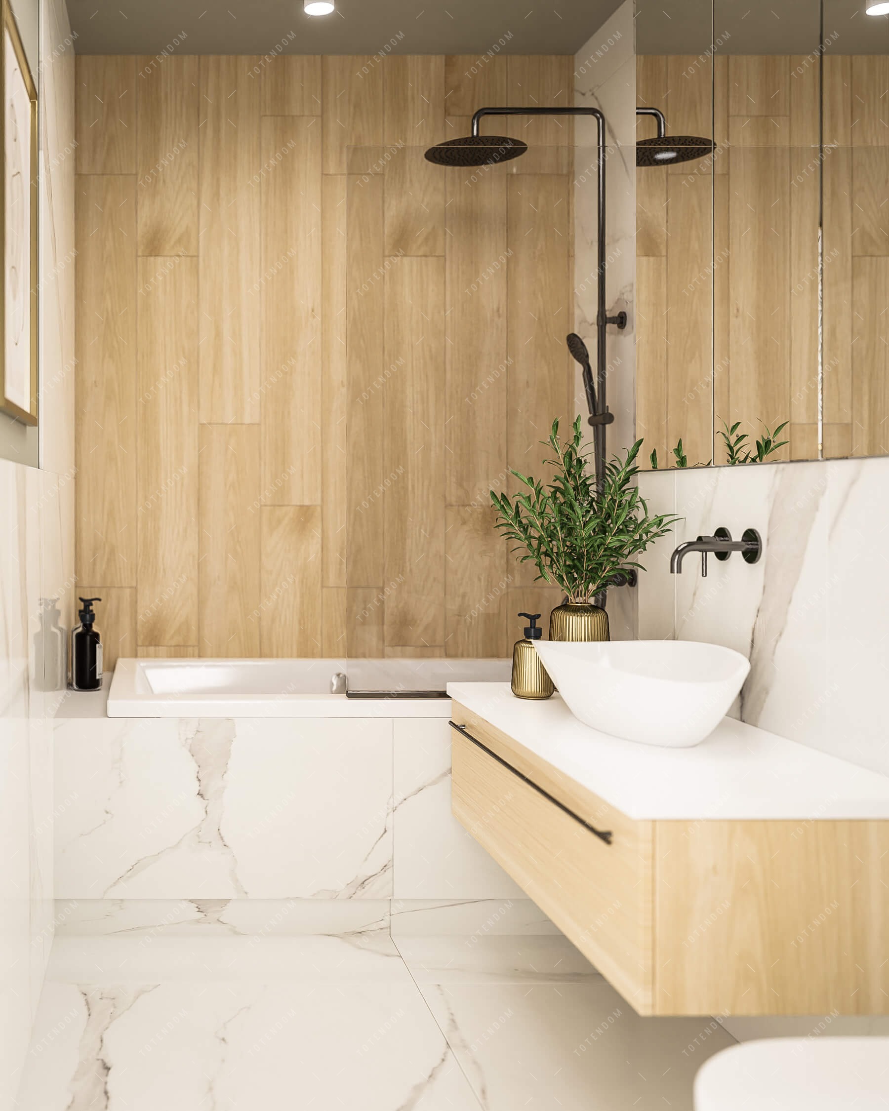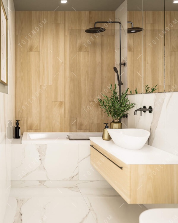 Wizualizacja łazienki, gdzie nowoczesność i naturalne piękno idą w parze. Wanna z deszczownicą stanowi doskonałe miejsce do odprężenia i odświeżenia. Jasne płytki tworzą optyczną lekkość i przestrzeń. Elementy drewniane dodają wnętrzu ciepła i przytulności. To łazienka emanuje harmonią, nowoczesnością i naturalnym urokiem, tworząc przestrzeń idealną do pielęgnacji i relaksu.