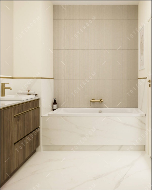Wizualizacja łazienki, gdzie jasne tony i złote akcenty tworzą harmonijną kompozycję. Biała wanna jest centralnym punktem, zapewniającym komfort i relaks podczas kąpieli. Duże lustro nad umywalką dodaje przestrzeni i dodatkowego oświetlenia. Ciemna szafka pod umywalką tworzy kontrast i dodaje elegancji. Złote akcenty w detalach wnętrza nadają mu wyjątkowego blasku.