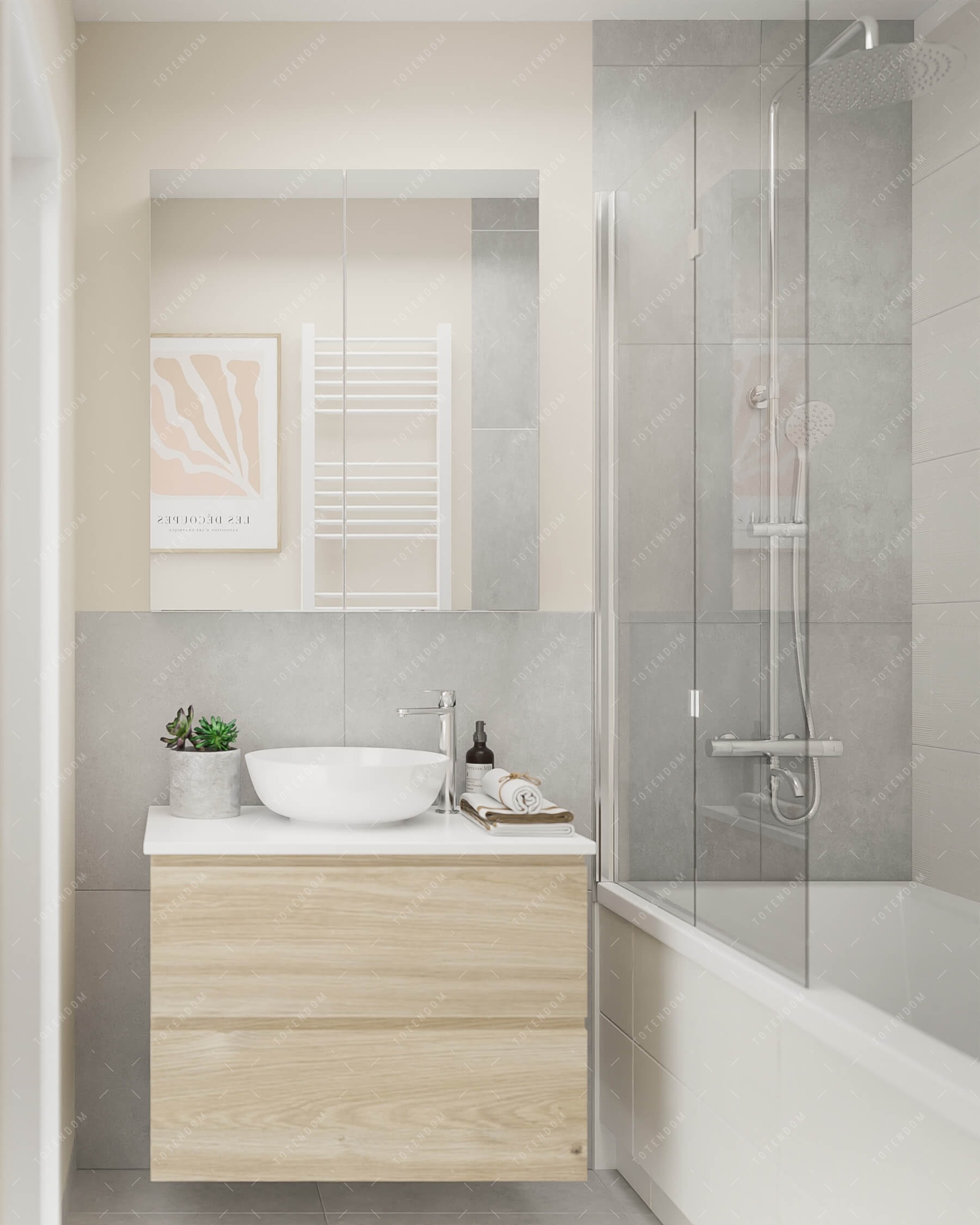 Wizualizacja łazienki, w której minimalizm spotyka się z funkcjonalnością. Wanna z deszczownicą stanowi centralny punkt, zapewniający relaksujące doznania podczas kąpieli. Nablatowa umywalka dodaje elegancji i ułatwia codzienne czynności. Przeszklona szafka nad zlewem dodaje lekkości i sprawia, że przestrzeń wydaje się większa. Ta łazienka emanuje prostotą, czystością i estetyką, tworząc minimalistyczną oazę spokoju i komfortu.