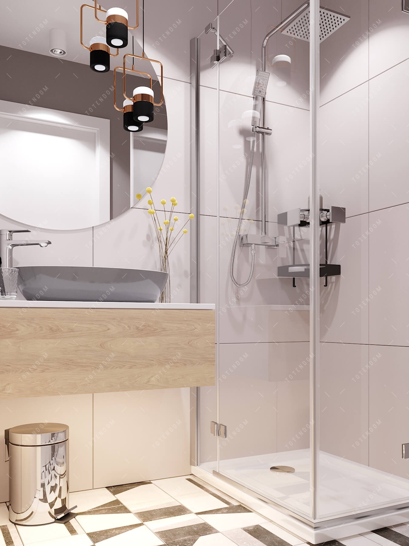 Wizualizacja łazienki, w której nowoczesność spotyka się z oryginalnością. Toaleta umieszczona we wnęce zapewnia prywatność i wygodę. Okrągłe lustro odbija światło i dodaje przestrzeni. Przeszklona kabina prysznicowa nadaje wnętrzu lekkości i przepuszczalności światła. Płytki z geometrycznymi wzorami tworzą w łazience unikalny charakter i styl.