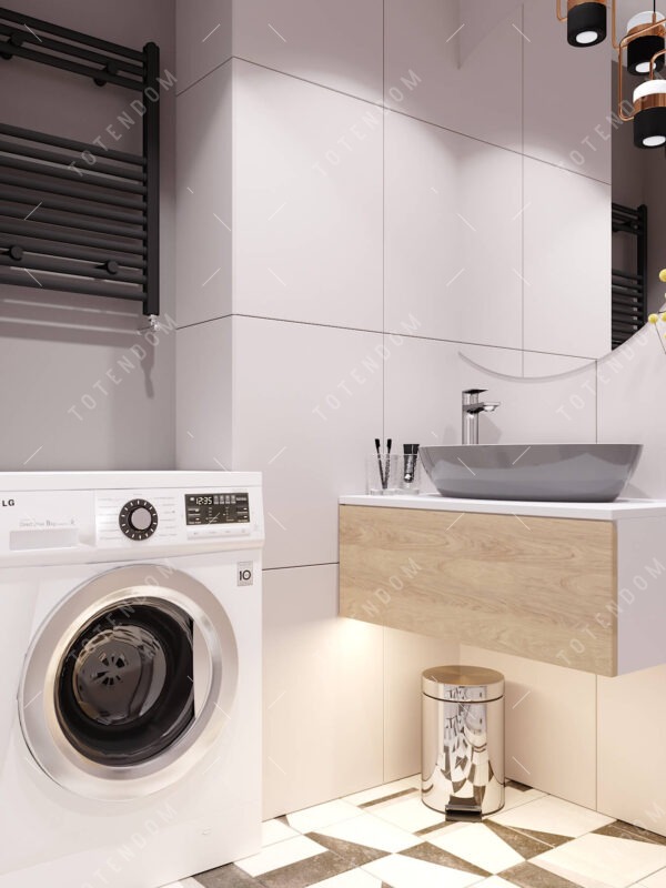Wizualizacja łazienki, w której nowoczesność spotyka się z oryginalnością. Toaleta umieszczona we wnęce zapewnia prywatność i wygodę. Okrągłe lustro odbija światło i dodaje przestrzeni. Przeszklona kabina prysznicowa nadaje wnętrzu lekkości i przepuszczalności światła. Płytki z geometrycznymi wzorami tworzą w łazience unikalny charakter i styl.