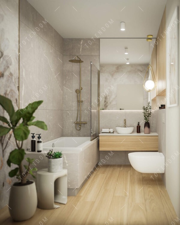 Wizualizacja luksusowej łazienki, w której elegancja i funkcjonalność idą w parze. Wanna z pozłacaną deszczownicą stanowi centralny element przyciągający uwagę i zapewniający przyjemne doznania podczas kąpieli. Jasne panele podłogowe dodają wnętrzu przestronności i lekkości. Zlew na blacie stanowi praktyczne i stylowe rozwiązanie. Ta łazienka emanuje luksusem i elegancją, tworząc oazę relaksu i komfortu.