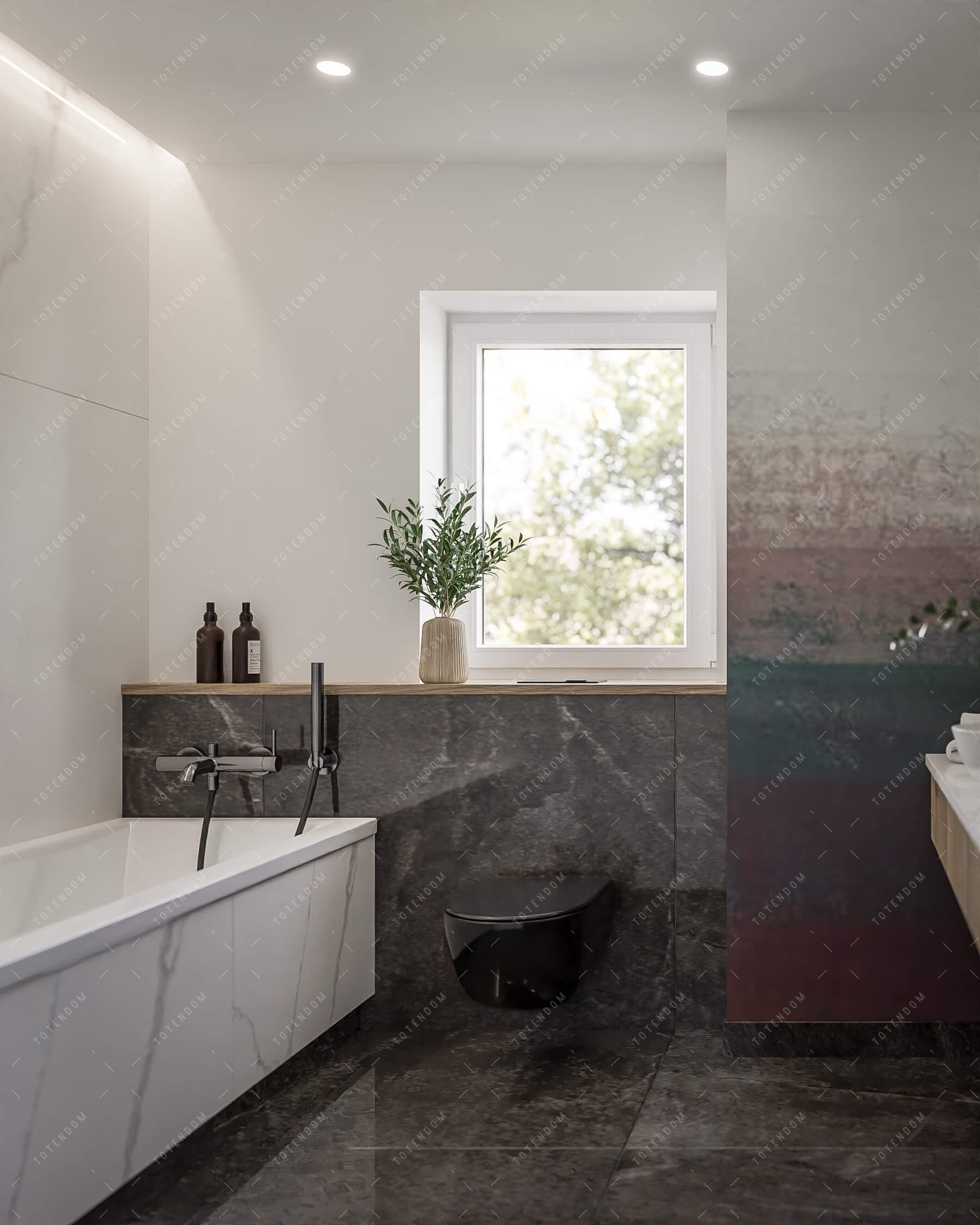 Wizualizacja nowoczesnej łazienki z wykorzystaniem ciemnych płytek, które nadają wnętrzu elegancji i wyrafinowania. Okno dostarcza naturalnego światła, ożywiając przestrzeń. Duże, okrągłe lustro stanowi centralny punkt aranżacji, dodając głębi i stylu. Czarna toaleta nadaje pomieszczeniu charakteru. Duża wanna zapewnia komfortowe miejsce do relaksu i odprężenia.