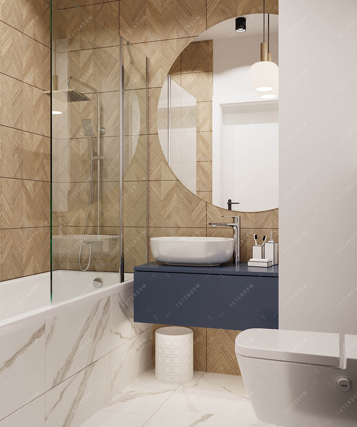 Wizualizacja łazienki o nowoczesnym wyglądzie, gdzie ściany zostały wykończone płytkami w jodełkę, tworząc interesujący wzór. Kolorystyka wnętrza oparta jest głównie na bieli i odcieniach szarości, co nadaje pomieszczeniu elegancji i czystości. Wanna z parawanem stanowi funkcjonalne rozwiązanie, pozwalając na wygodne korzystanie zarówno z prysznica, jak i kąpieli. Duże, okrągłe lustro dodaje przestrzeni i optycznie ją powiększa.