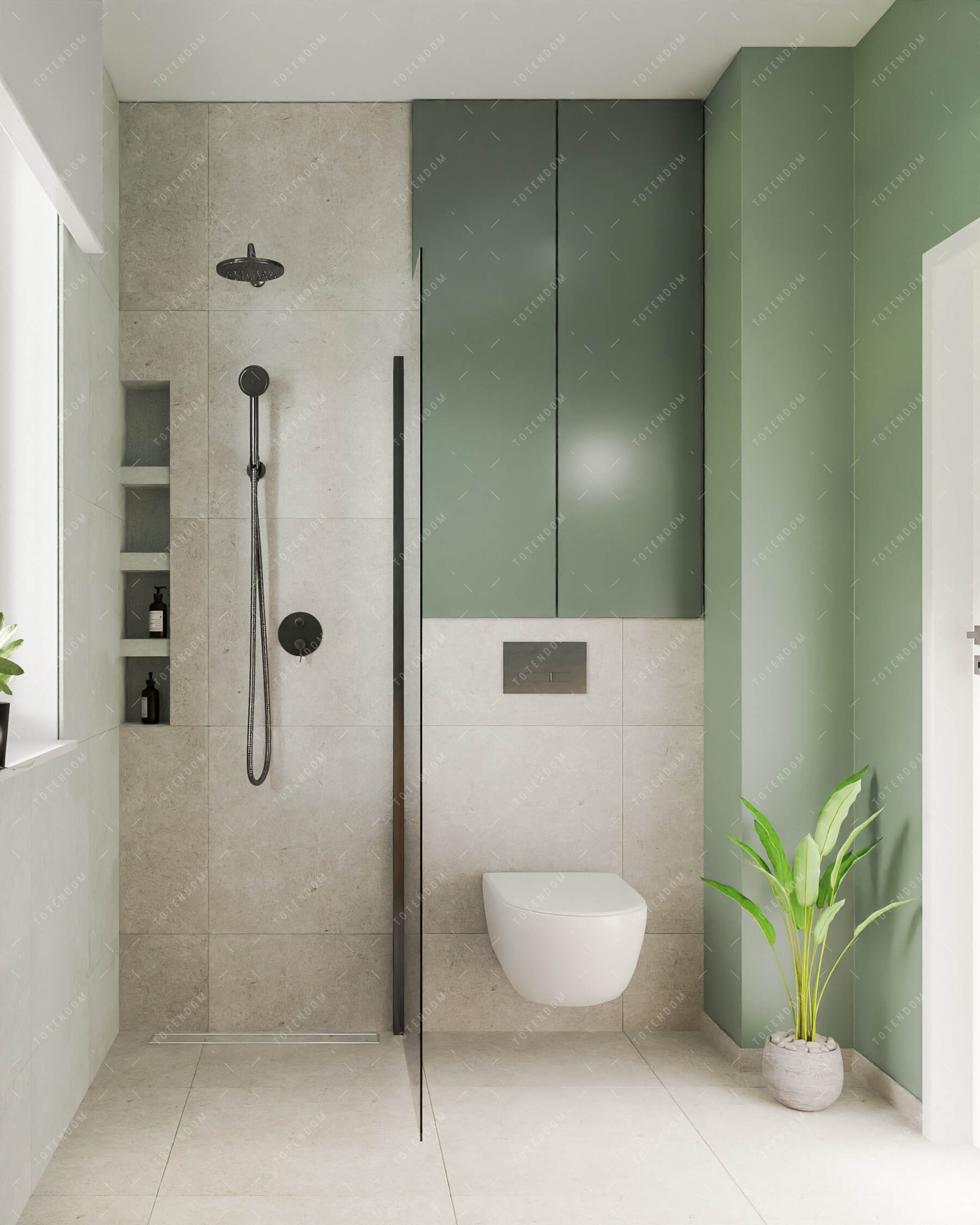 Witaj w łazience o charakterze nowoczesnym i świeżym. Zielone ściany i blat nadają temu pomieszczeniu naturalny i relaksujący wygląd. Kabinę prysznicową typu walk-in wkomponowano harmonijnie w przestrzeń, zapewniając swobodę ruchu podczas korzystania z prysznica. Nad umywalką znajduje się wiszące lustro, które odbija światło wpadające przez okno, dodając przestrzeni dodatkowej jasności i otwartości. Ta łazienka jest idealnym miejscem do odprężenia i cieszenia się przyjemnością codziennych rytuałów.