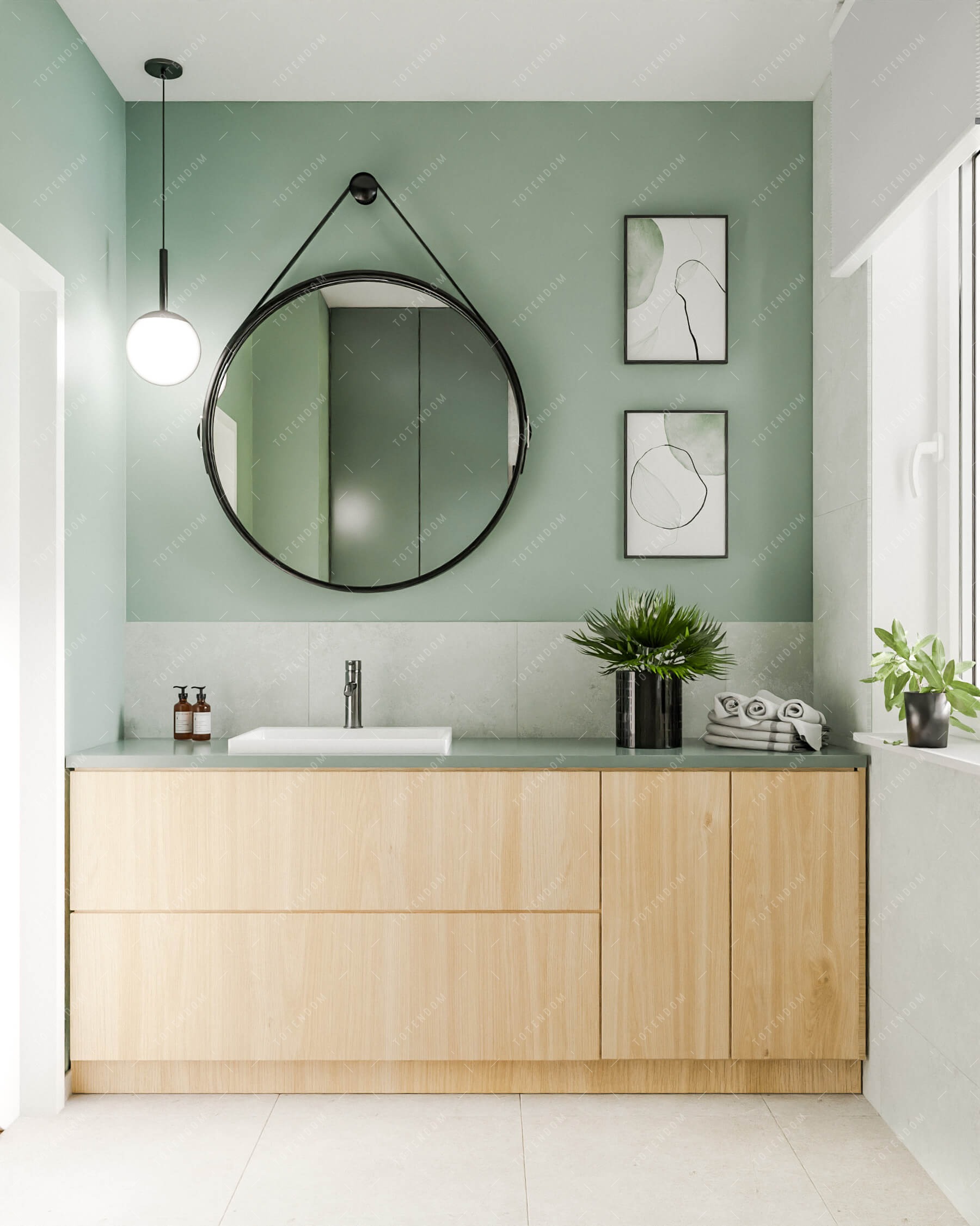 Witaj w łazience o charakterze nowoczesnym i świeżym. Zielone ściany i blat nadają temu pomieszczeniu naturalny i relaksujący wygląd. Kabinę prysznicową typu walk-in wkomponowano harmonijnie w przestrzeń, zapewniając swobodę ruchu podczas korzystania z prysznica. Nad umywalką znajduje się wiszące lustro, które odbija światło wpadające przez okno, dodając przestrzeni dodatkowej jasności i otwartości. Ta łazienka jest idealnym miejscem do odprężenia i cieszenia się przyjemnością codziennych rytuałów.
