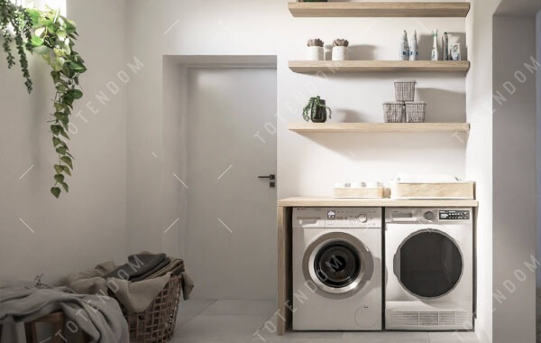 Ta skandynawska pralnio-suszarnia jest idealnym przykładem funkcjonalnego i stylowego pomieszczenia. Jasna kolorystyka dominuje, dając uczucie przestronności i świeżości. Drewniane elementy dodają naturalnego ciepła i charakteru. Na jednej ścianie znajduje się pralka i suszarka, umieszczone obok siebie, gotowe do codziennego użytku. Półki nad blatem zapewniają wygodne miejsce na akcesoria, a kosz na pranie ułatwia organizację. Wysoka szafa dostarcza dużo miejsca na przechowywanie detergentów. Małe okno przepuszcza delikatne światło, dodając przyjemnej atmosfery.