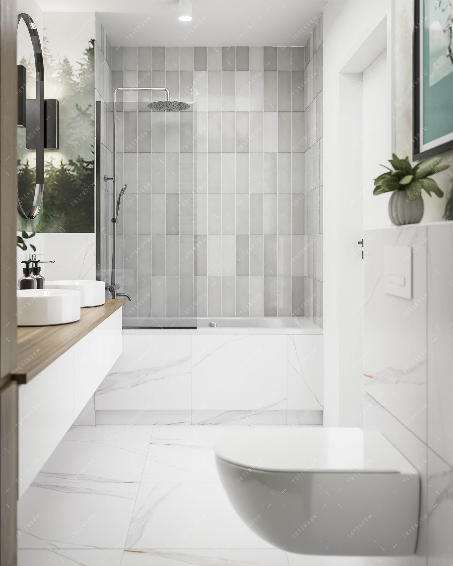 Wejdź do tej przestronnej łazienki, gdzie funkcjonalność spotyka elegancję. Dwie umywalki umieszczone na blacie zapewniają wygodę i komfort dla dwóch osób jednocześnie. Dwustronne lustra wzbogacają przestrzeń, odbijając światło i dodając głębi wnętrzu. Drewniana szafa dodaje ciepła i przytulności, jednocześnie oferując miejsce do przechowywania. Wanna z parawanem zapewnia zarówno możliwość szybkiego prysznica, jak i relaksującej kąpieli. To miejsce, gdzie codzienne rutyny stają się przyjemnością.
