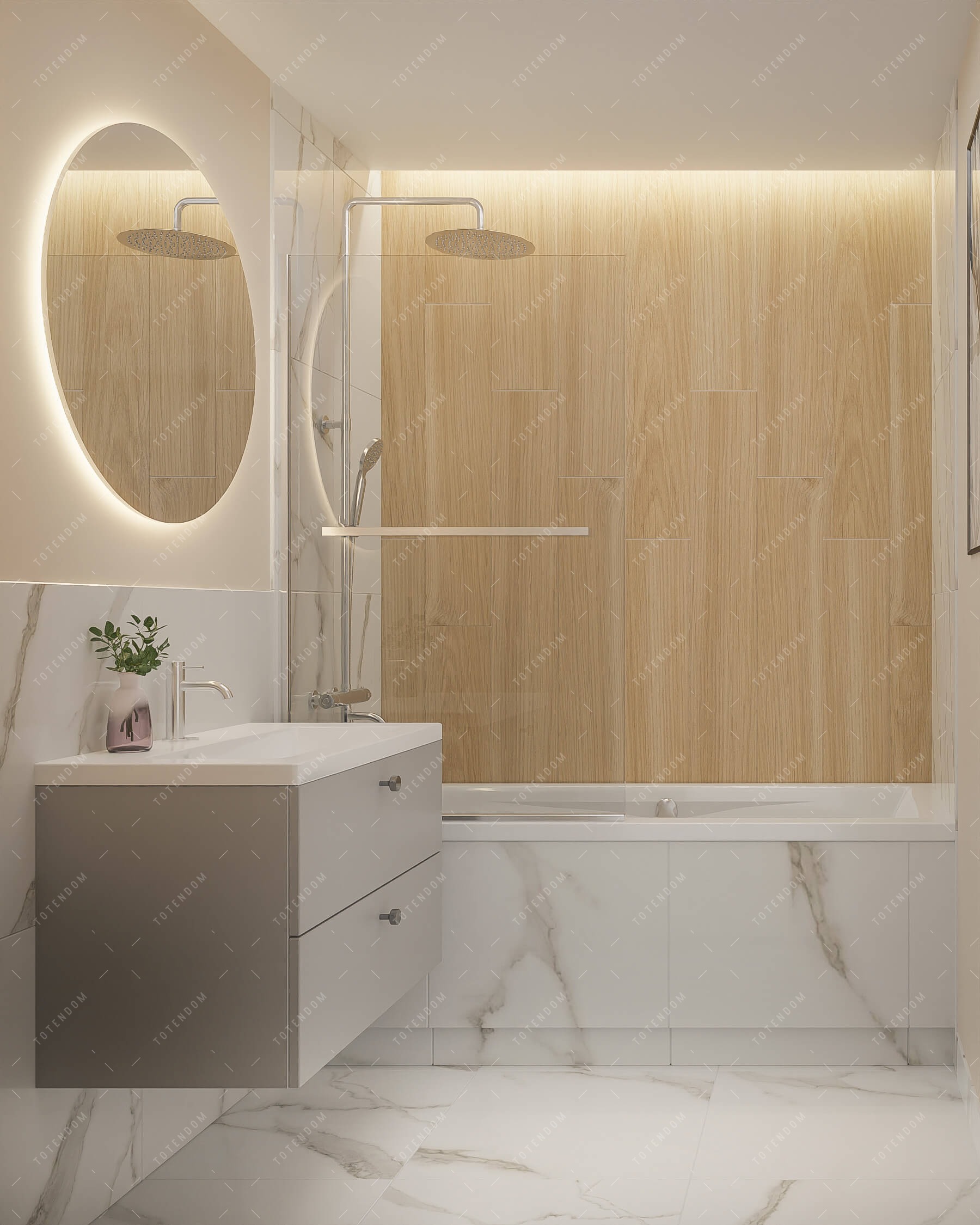 Wejdź do tej nowoczesnej łazienki, gdzie luksus spotyka funkcjonalność. Wanna z parawanem i deszczownicą oferuje możliwość zarówno relaksującej kąpieli, jak i szybkiego prysznica. Podświetlane okrągłe lustro dodaje elegancji i sprawia, że wnętrze jest jasne i optyczne. Szafka z szufladami pod umywalką zapewnia praktyczne miejsce do przechowywania i utrzymania porządku. To miejsce, gdzie codzienna higiena zamienia się w przyjemny rytuał i chwile relaksu.