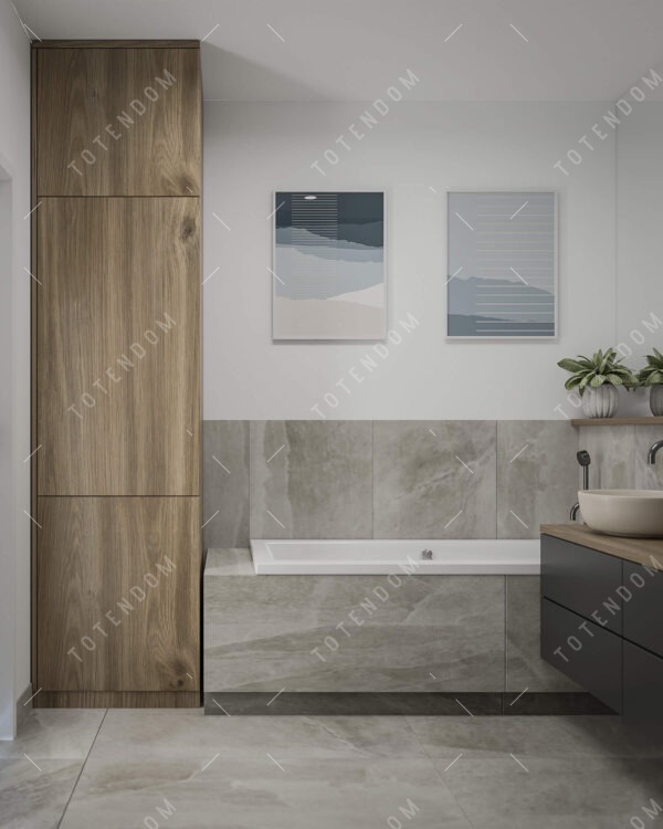 Wchodząc do tej łazienki natychmiast poczujesz atmosferę czystej elegancji. Umywalka nablatowa dodaje nowoczesnego uroku, a pojemne szuflady pod nią zapewniają wygodne przechowywanie niezbędnych przedmiotów. Jasnoszara kolorystyka nadają pomieszczeniu subtelny, minimalistyczny charakter. Centralnym punktem jest biała wanna, zapraszająca do relaksującej kąpieli. To miejsce, w którym każde poranne i wieczorne rytuały stają się przyjemnością.