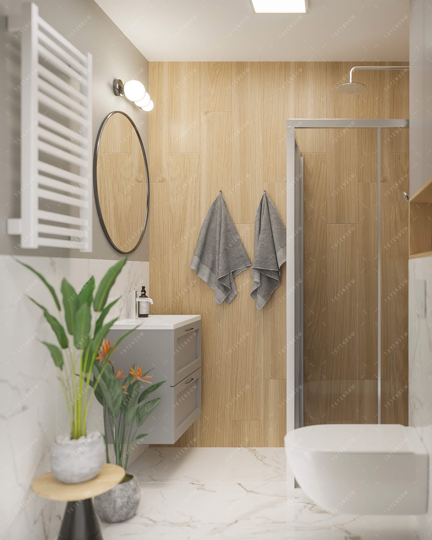 Ta łazienka emanuje nowoczesnym stylem i funkcjonalnością. Kinkiet nad lustrem dostarcza przyjemnego oświetlenia, podkreślając jego elegancję. Narożna kabina prysznicowa zapewnia komfortowe i przestronne miejsce do relaksu. Umywalka wbudowana w szafkę nie tylko dodaje stylu, ale także oferuje praktyczne miejsce do przechowywania. To łazienka, w której design i wygoda idą w parze, tworząc harmonijne i praktyczne wnętrze.
