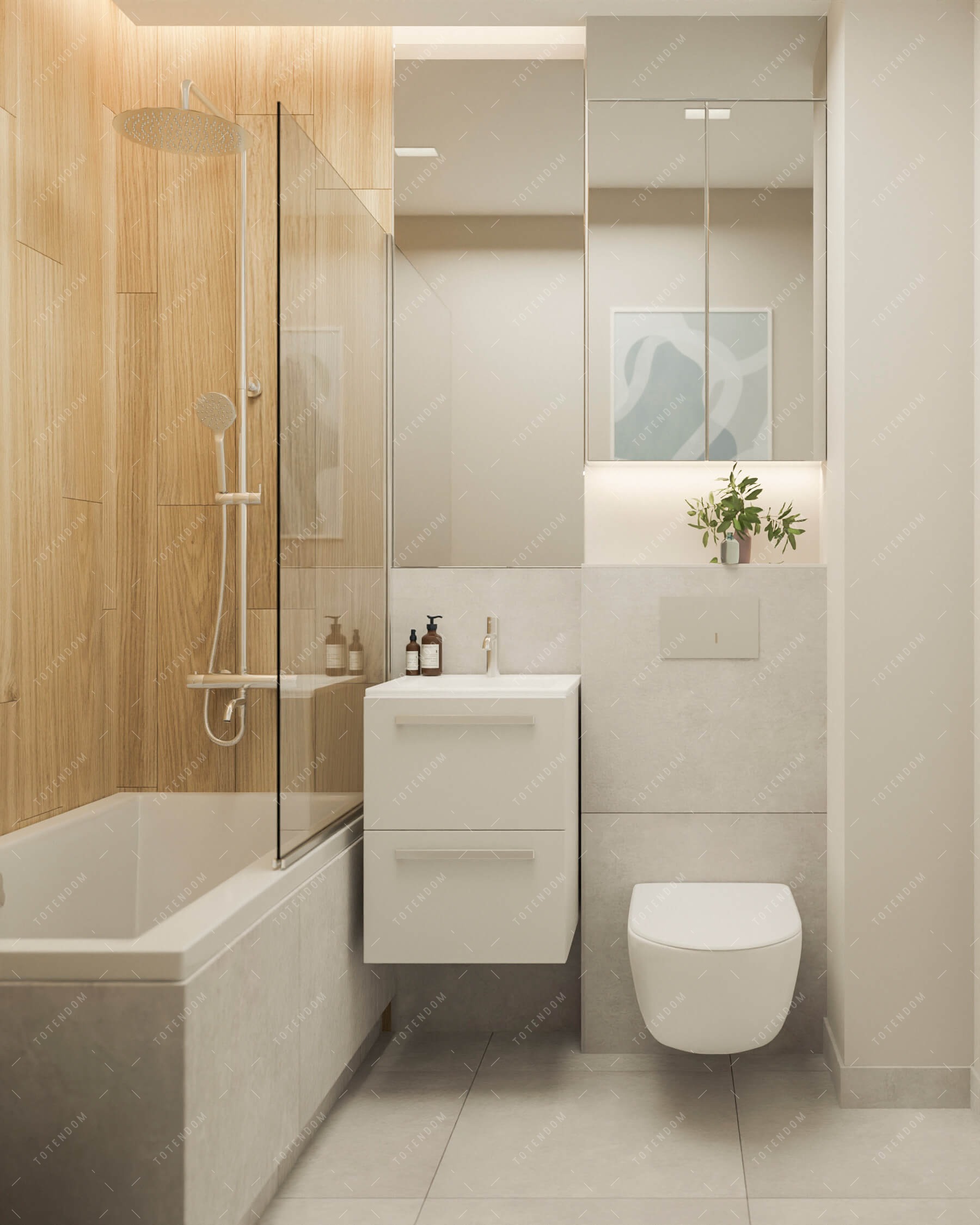 Ta mała łazienka udowadnia, że nawet niewielka przestrzeń może być funkcjonalna i stylowa. Mądre wykorzystanie przestrzeni pozwoliło na umieszczenie w niej wanny z parawanem, która zapewnia zarówno możliwość relaksującej kąpieli, jak i szybkiego prysznica z użyciem deszczownicy. Umywalka wbudowana w szafkę to praktyczne rozwiązanie, które pozwala na przechowywanie niezbędnych przedmiotów. Szafka z lustrem nad toaletą dodaje nie tylko dodatkowego miejsca do przechowywania, ale również optycznie powiększa przestrzeń.