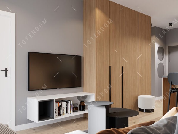W tym salonie z elegancką kanapą narożną panuje harmonijna atmosfera. Dywan pod kanapą dodaje przytulności i komfortu, tworząc idealną strefę relaksu. Ciekawy stolik stanowi efektowny element centralny, dodając oryginalności i stylu do wnętrza. Zabudowana szafa oferuje praktyczne rozwiązanie przechowywania, utrzymując porządek w pomieszczeniu.