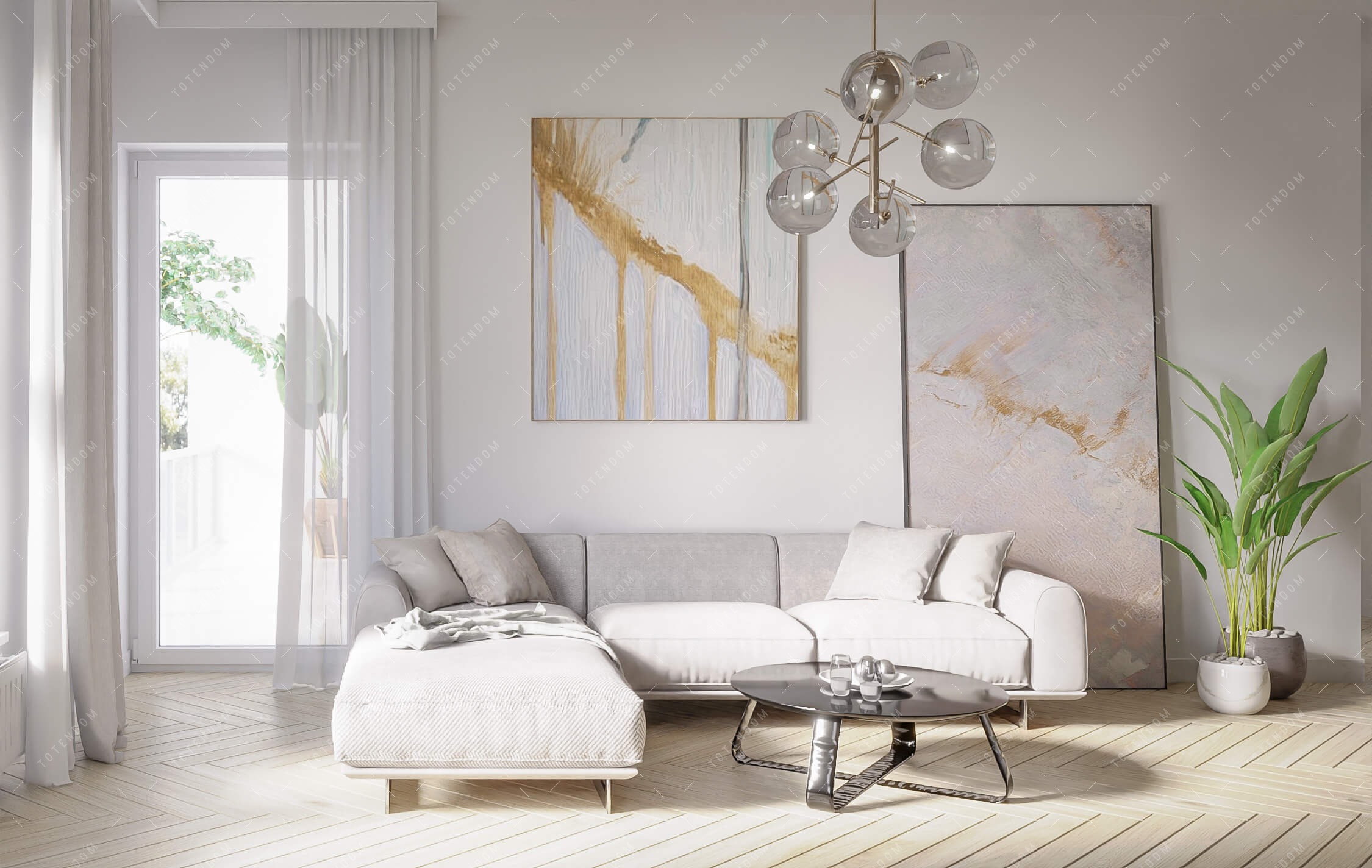Ten salon jest przykładem stylowego i wyjątkowego wnętrza. Podłoga w jodełkę dodaje mu charakteru i unikalności, tworząc interesujący wzór na podłodze. Narożna kanapa zapewnia komfortowy i funkcjonalny kącik do relaksu i spotkań z bliskimi. Modernistyczne obrazy na ścianach nadają pomieszczeniu artystyczny wygląd, tworząc wyraziste punkty centralne. Efektowny żyrandol dodaje elegancji i prestiżu, nadając wnętrzu niepowtarzalny urok.