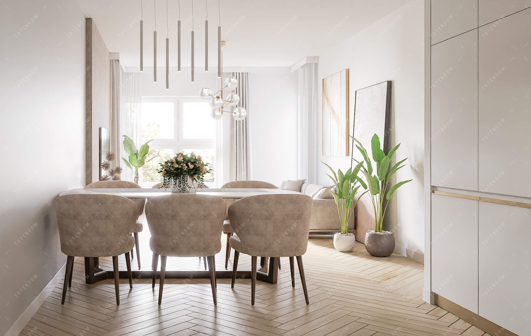 Ten salon jest przykładem stylowego i wyjątkowego wnętrza. Podłoga w jodełkę dodaje mu charakteru i unikalności, tworząc interesujący wzór na podłodze. Narożna kanapa zapewnia komfortowy i funkcjonalny kącik do relaksu i spotkań z bliskimi. Modernistyczne obrazy na ścianach nadają pomieszczeniu artystyczny wygląd, tworząc wyraziste punkty centralne. Efektowny żyrandol dodaje elegancji i prestiżu, nadając wnętrzu niepowtarzalny urok.