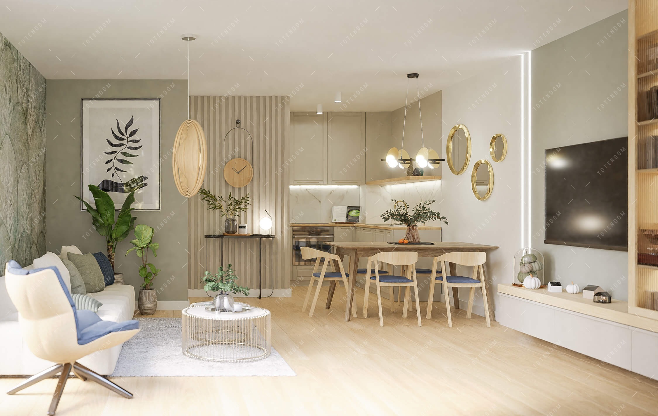 W tym salonie podłużna kanapa zapewnia stylowy i wygodny obszar do relaksu i spotkań z bliskimi. Intrygujący żyrandol stanowi efektowny element centralny, dodając elegancji i przykuwając wzrok. Panele podłogowe tworzą przytulną i naturalną atmosferę. Przeszklona szafka nadaje lekkości i nowoczesności, jednocześnie umożliwiając wyeksponowanie dekoracyjnych przedmiotów.