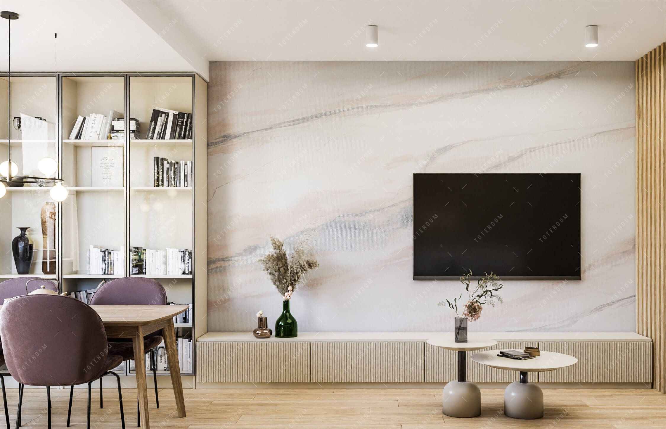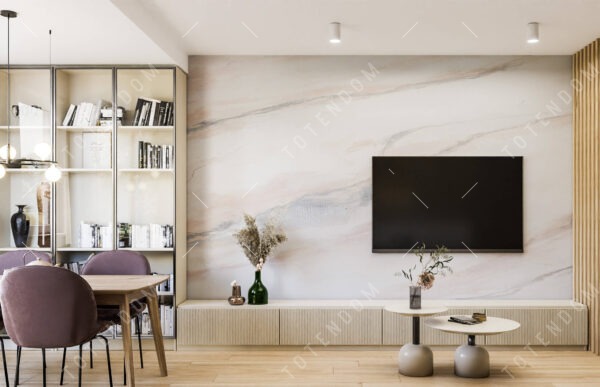 Ten salon to nowoczesna przestrzeń z przeszklonym regałem, dużą szarą kanapą i designerskim stolikiem. Minimalistyczny design, stonowana kolorystyka i eleganckie akcenty tworzą przestronną i stylową strefę odpoczynku.