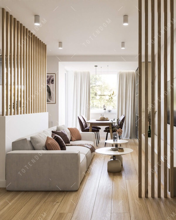 Ten salon to nowoczesna przestrzeń z przeszklonym regałem, dużą szarą kanapą i designerskim stolikiem. Minimalistyczny design, stonowana kolorystyka i eleganckie akcenty tworzą przestronną i stylową strefę odpoczynku.