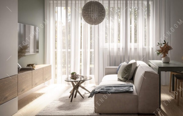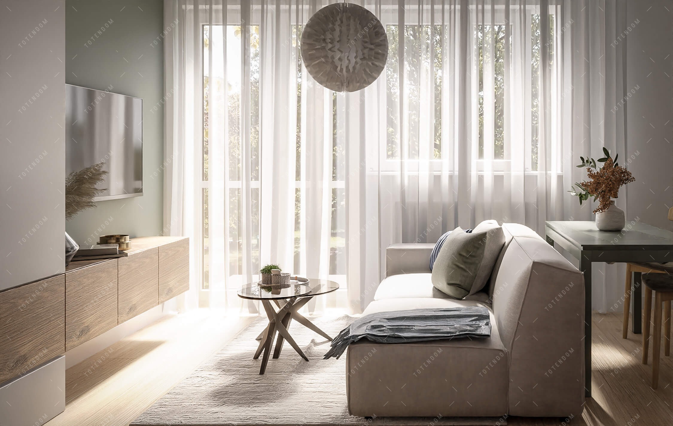 Wizualizacja jasnego salonu, który jest doskonale doświetlony naturalnym światłem. Duże okna zapewniają obfitą ilość światła, które sprawia, że wnętrze wydaje się przestronne i przyjazne. Wnętrze jest ozdobione zielonymi akcentami, które dodają świeżości i natury. Stół z umieszczoną przed nim kanapą tworzy przytulne miejsce do spotkań i relaksu. Pod kawowym stolikiem znajduje się miękki dywan, który dodaje ciepła i wygody całej przestrzeni.