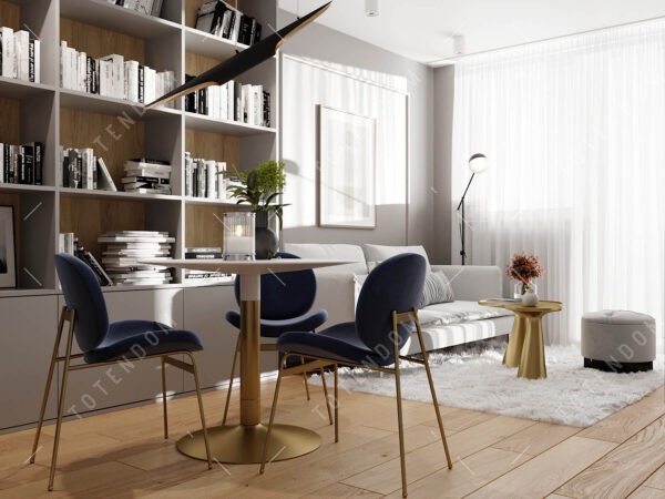 Wizualizacja eleganckiego salonu, w którym dominują złote elementy, dodając mu luksusowego charakteru. Biały dywan o ciekawej teksturze podkreśla czystość i wyrafinowanie przestrzeni. Okrągłe lustro na ścianie staje się wyjątkowym punktem centralnym, odbijającym światło i nadającym wnętrzu głębi. Regał na książki nadaje osobistego charakteru pomieszczeniu. Biała kanapa zapewnia miejsce do odpoczynku, a stół jadalny w towarzystwie granatowych krzeseł ze złotymi akcentami tworzy eleganckie miejsce na posiłki.