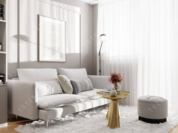 Wizualizacja eleganckiego salonu, w którym dominują złote elementy, dodając mu luksusowego charakteru. Biały dywan o ciekawej teksturze podkreśla czystość i wyrafinowanie przestrzeni. Okrągłe lustro na ścianie staje się wyjątkowym punktem centralnym, odbijającym światło i nadającym wnętrzu głębi. Regał na książki nadaje osobistego charakteru pomieszczeniu. Biała kanapa zapewnia miejsce do odpoczynku, a stół jadalny w towarzystwie granatowych krzeseł ze złotymi akcentami tworzy eleganckie miejsce na posiłki.
