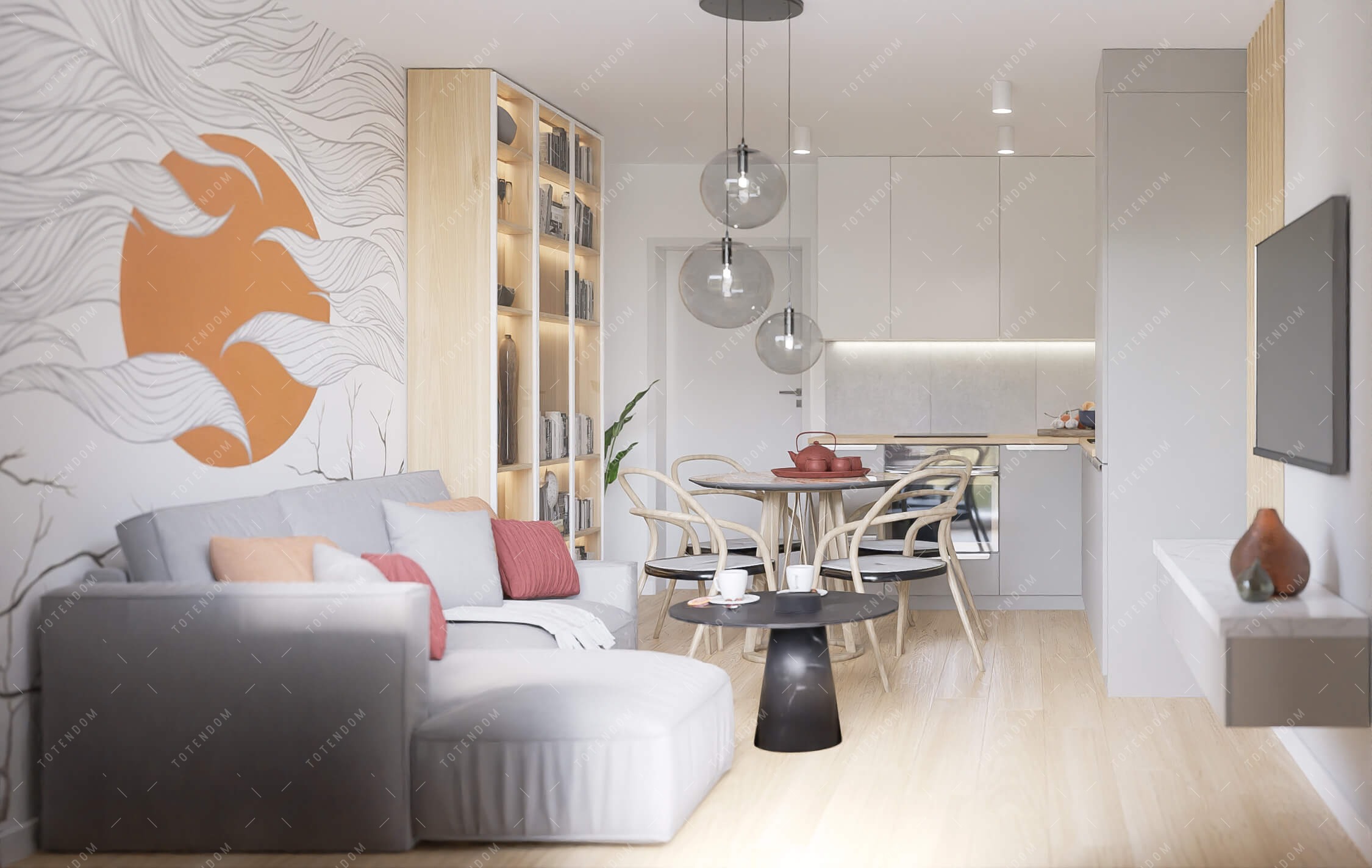 Wizualizacja nowoczesnego salonu o jasnym wystroju, który emanuje harmonią i stylem. Artystyczna ściana stanowi efektowne tło, dodając pomieszczeniu wyjątkowego charakteru. Kanapa z ozdobnymi poduszkami staje się centrum relaksu, zapewniając wygodne miejsce do wypoczynku. Regał ekspozycyjny pełen sztuki i dekoracji dodaje artyzmu oraz stanowi idealne miejsce do prezentacji kolekcji. To przestronne i designerskie wnętrze salonu, które zachwyca prostotą, estetyką i artystycznym wyrafinowaniem.