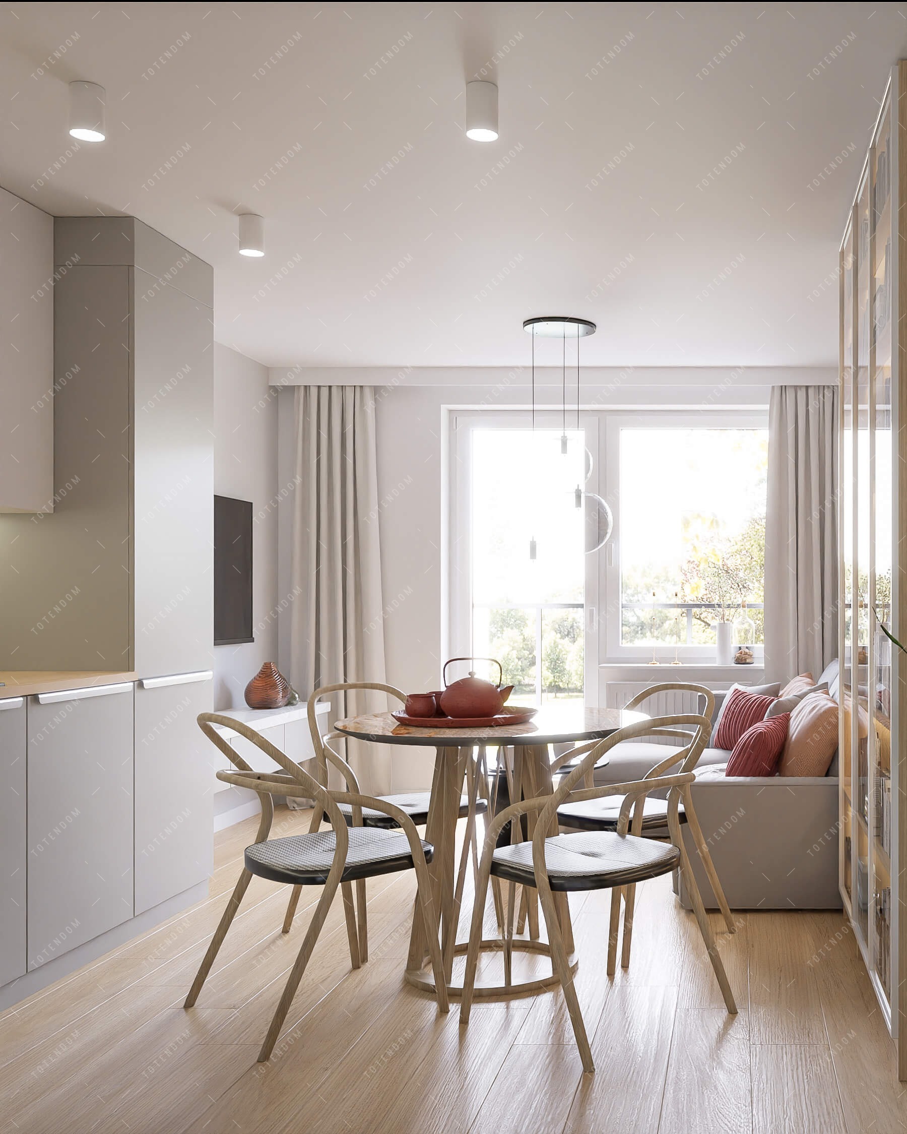 Wizualizacja nowoczesnego salonu o jasnym wystroju, który emanuje harmonią i stylem. Artystyczna ściana stanowi efektowne tło, dodając pomieszczeniu wyjątkowego charakteru. Kanapa z ozdobnymi poduszkami staje się centrum relaksu, zapewniając wygodne miejsce do wypoczynku. Regał ekspozycyjny pełen sztuki i dekoracji dodaje artyzmu oraz stanowi idealne miejsce do prezentacji kolekcji. To przestronne i designerskie wnętrze salonu, które zachwyca prostotą, estetyką i artystycznym wyrafinowaniem.