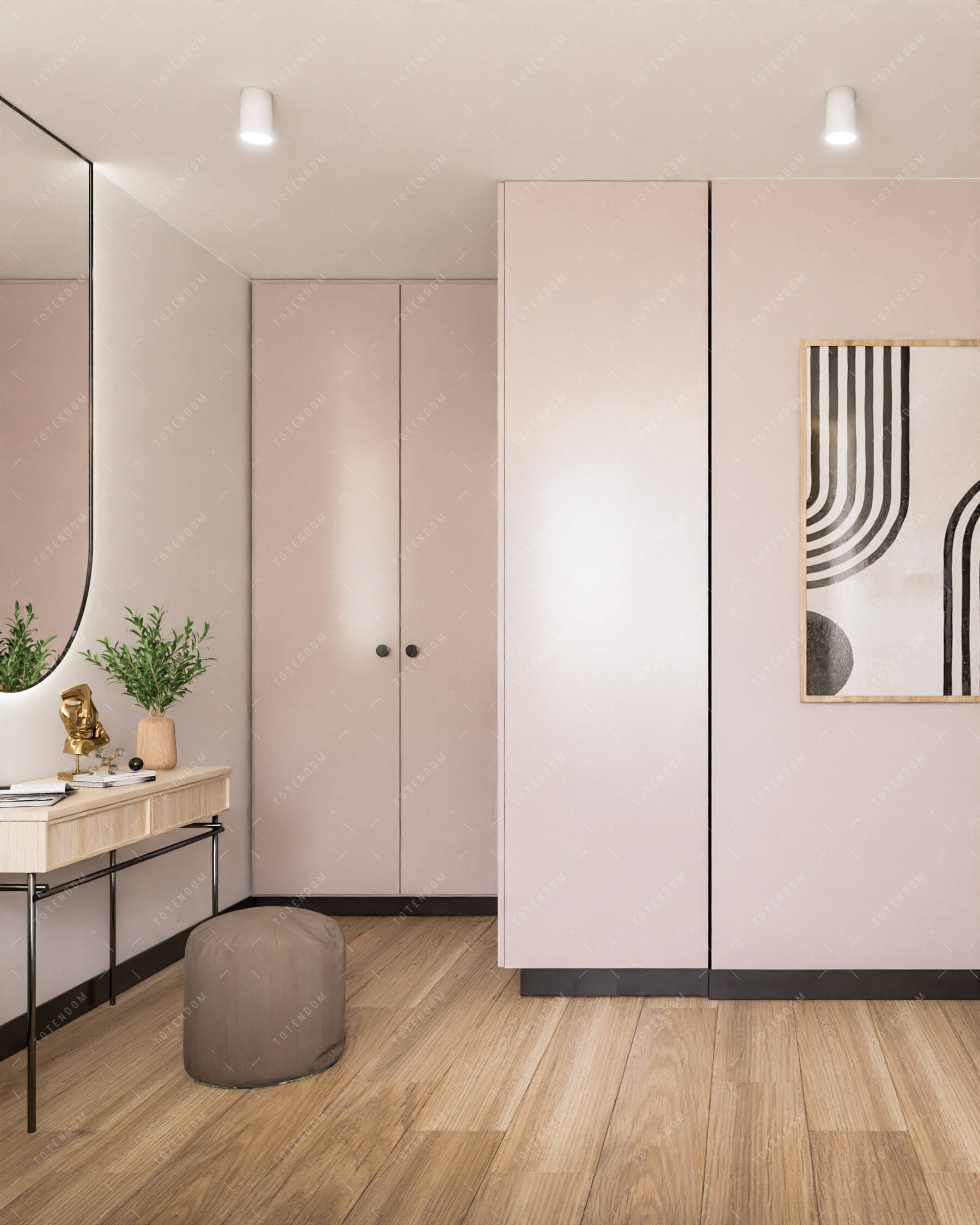 Wizualizacja salonu o pastelowej kolorystyce, która nadaje mu delikatności i subtelności. Przestronne wnętrze jest dobrze oświetlone, zapewniając przyjemne i jasne otoczenie. Duża kanapa staje się centralnym miejscem spotkań i relaksu. Okrągły stół tworzy przytulną przestrzeń na posiłki lub inspirujące rozmowy. Szafka w kolorze pudrowego różu dodaje uroku i charakteru całej aranżacji. To wnętrze emanuje spokojem i delikatnością, tworząc przyjemne miejsce do wypoczynku.