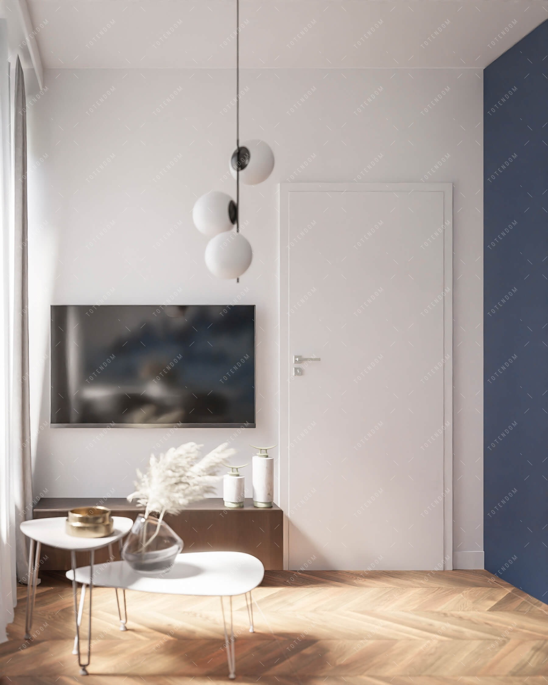 Wizualizacja salonu, w którym ciemnoniebieska kolorystyka jest podkreślona wyraźnymi akcentami. Lampy kule nadają wnętrzu subtelnego oświetlenia i tworzą przyjemną atmosferę. Jasna i duża kanapa zapewnia wygodne miejsce do wypoczynku i relaksu. Malowidło na ścianie z palmami dodaje tropikalnego uroku i odrobinę egzotyki. To wnętrze emanuje spokojem i elegancją, tworząc przytulne miejsce do odpoczynku w przyjemnej atmosferze.