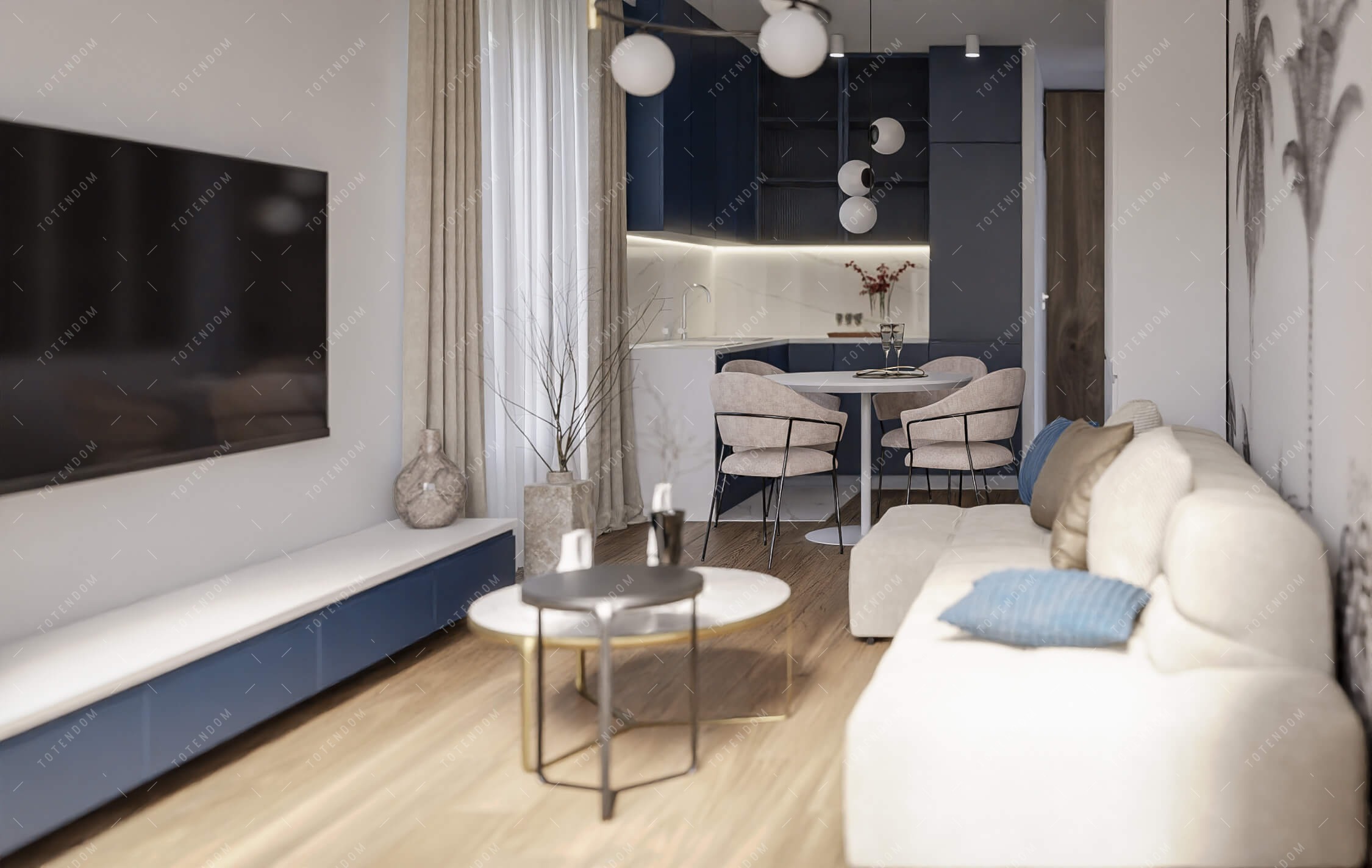 Wizualizacja salonu, w którym ciemnoniebieska kolorystyka jest podkreślona wyraźnymi akcentami. Lampy kule nadają wnętrzu subtelnego oświetlenia i tworzą przyjemną atmosferę. Jasna i duża kanapa zapewnia wygodne miejsce do wypoczynku i relaksu. Malowidło na ścianie z palmami dodaje tropikalnego uroku i odrobinę egzotyki. To wnętrze emanuje spokojem i elegancją, tworząc przytulne miejsce do odpoczynku w przyjemnej atmosferze.