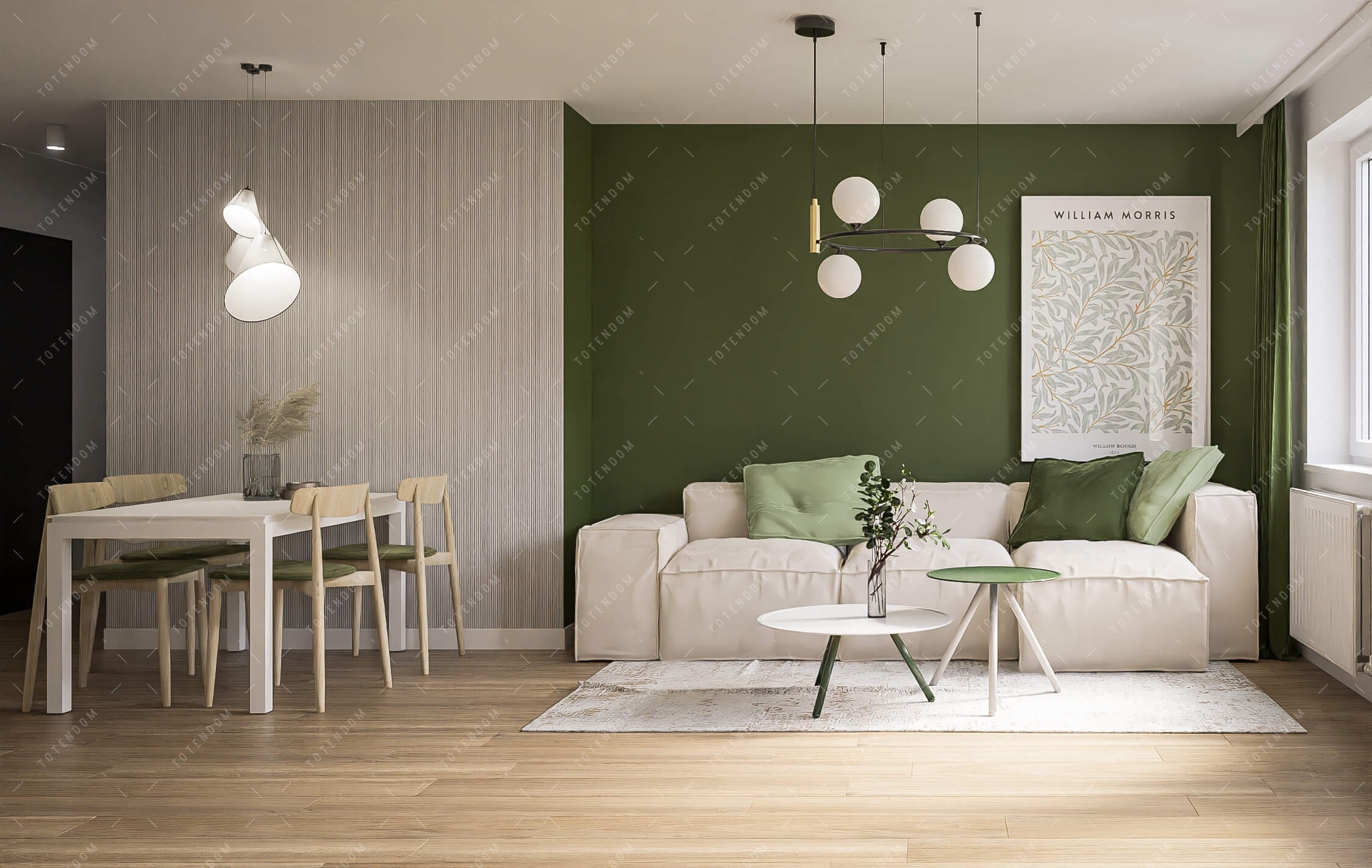 Wizualizacja salonu o świeżym i lekkim charakterze, któremu zielone elementy dodają naturalnego piękna. Biała kanapa stanowi miejsce do odpoczynku i relaksu. Panele podłogowe nadają wnętrzu elegancji i nowoczesności. Lampa umieszczona nad kanapą tworzy przyjemne oświetlenie. To wnętrze emanuje przyjemną i świeżą aurą, zapraszając do spędzania czasu w relaksacyjnej atmosferze.