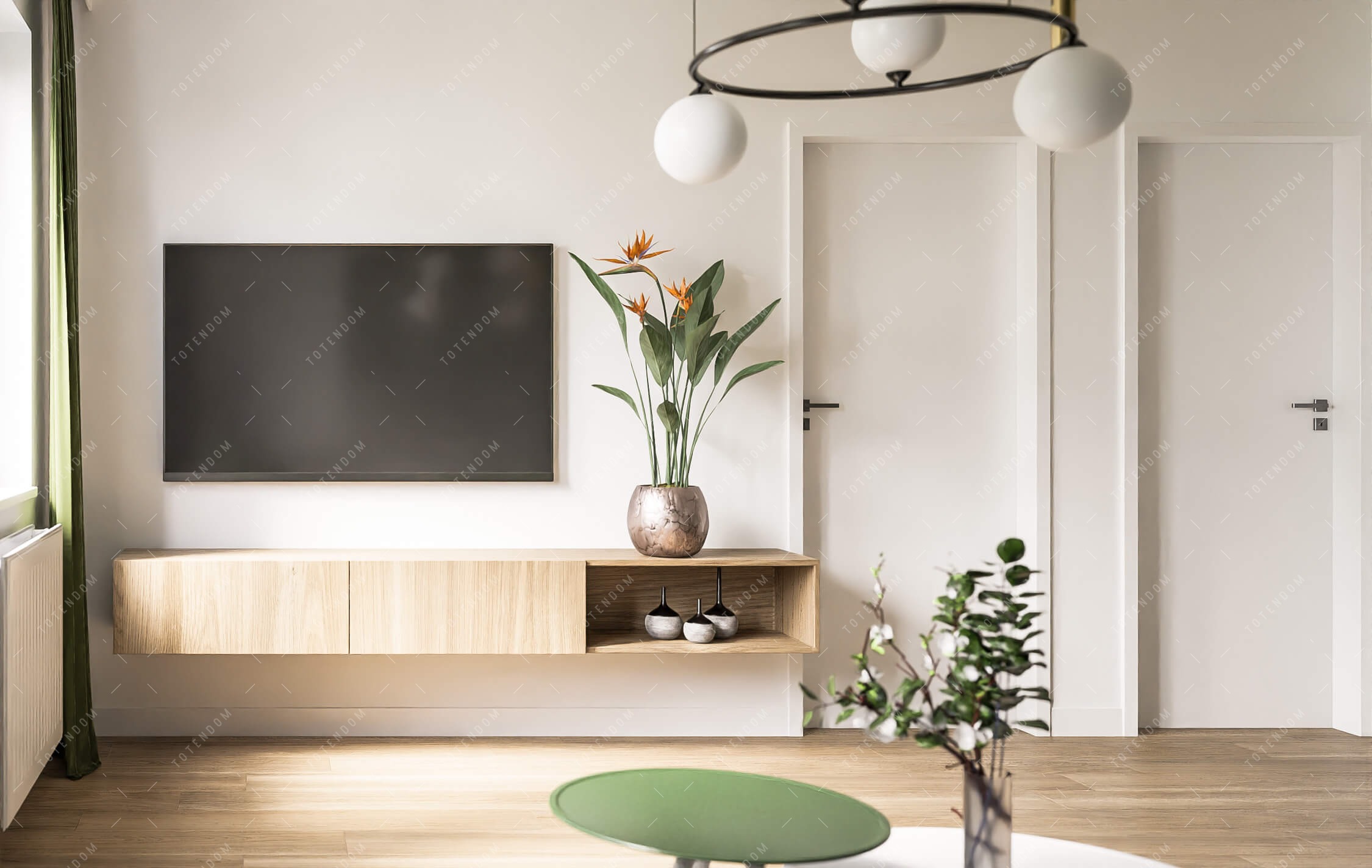 Wizualizacja salonu o świeżym i lekkim charakterze, któremu zielone elementy dodają naturalnego piękna. Biała kanapa stanowi miejsce do odpoczynku i relaksu. Panele podłogowe nadają wnętrzu elegancji i nowoczesności. Lampa umieszczona nad kanapą tworzy przyjemne oświetlenie. To wnętrze emanuje przyjemną i świeżą aurą, zapraszając do spędzania czasu w relaksacyjnej atmosferze.