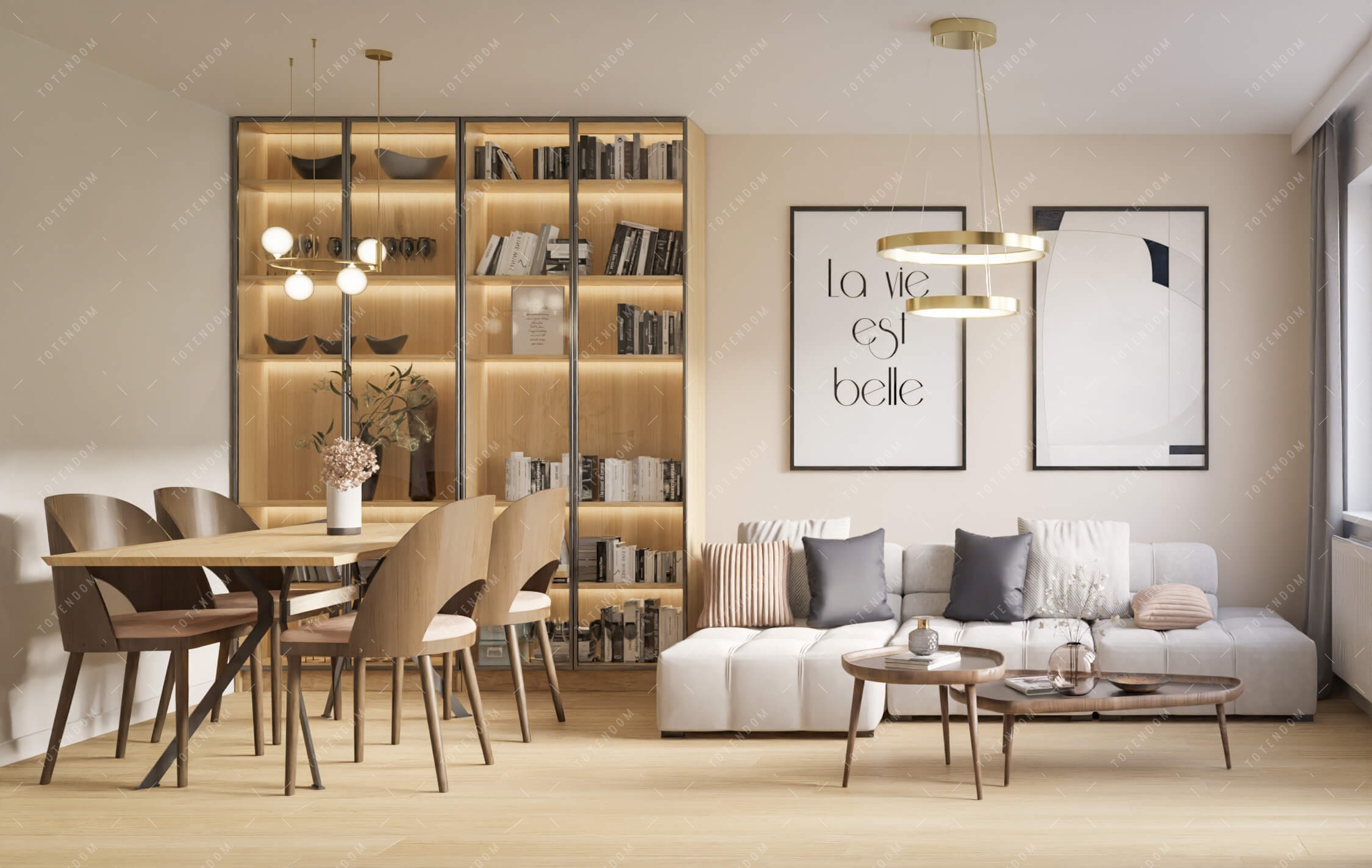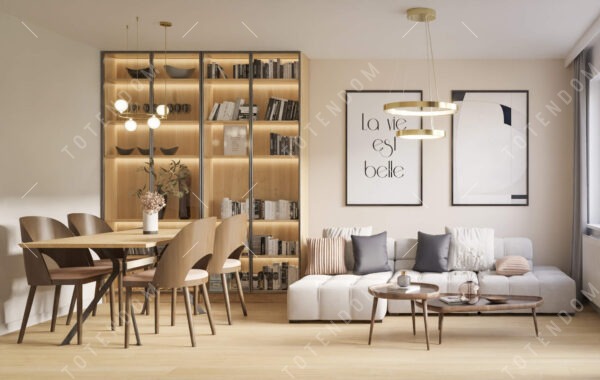Wizualizacja salonu, gdzie ciepłe kolory ziemi tworzą przytulną i harmonijną atmosferę. Dominacja drewnianych elementów dodaje naturalnego uroku i przywołuje do wnętrza przyjemne uczucie bliskości natury. Duży stół z pięknymi krzesłami staje się centralnym punktem spotkań. Jasna kanapa zapewnia wygodne miejsce do odpoczynku i relaksu. Imponujący regał stanowi zarówno praktyczne rozwiązanie do przechowywania, jak i dekoracyjny element wnętrza.