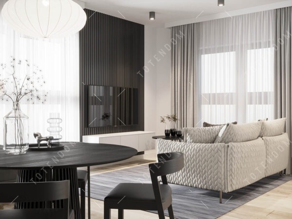Wizualizacja salonu emanującego elegancją i ponadczasowym stylem. Odcienie szarości tworzą harmonijną atmosferę, podkreślając minimalistyczny design. Czarny stół dodaje przestrzeni wyrafinowanego charakteru. Jasna kanapa zapewnia komfortowy punkt odpoczynku, a okrągłe lustro nadaje głębi i optycznego powiększenia wnętrza. Wygodny fotel stanowi idealne miejsce do relaksu i zatopienia się w ulubionej lekturze.