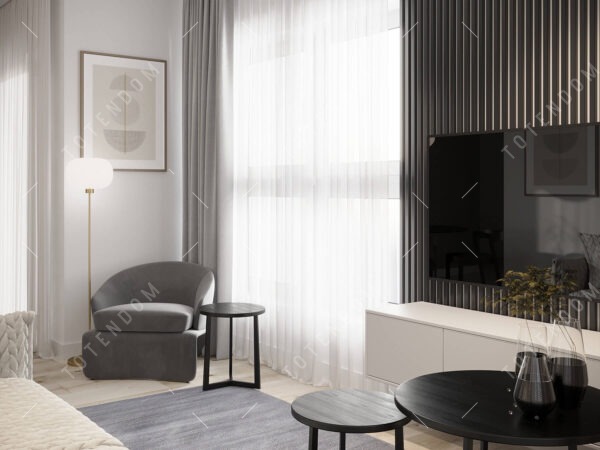 Wizualizacja salonu emanującego elegancją i ponadczasowym stylem. Odcienie szarości tworzą harmonijną atmosferę, podkreślając minimalistyczny design. Czarny stół dodaje przestrzeni wyrafinowanego charakteru. Jasna kanapa zapewnia komfortowy punkt odpoczynku, a okrągłe lustro nadaje głębi i optycznego powiększenia wnętrza. Wygodny fotel stanowi idealne miejsce do relaksu i zatopienia się w ulubionej lekturze.
