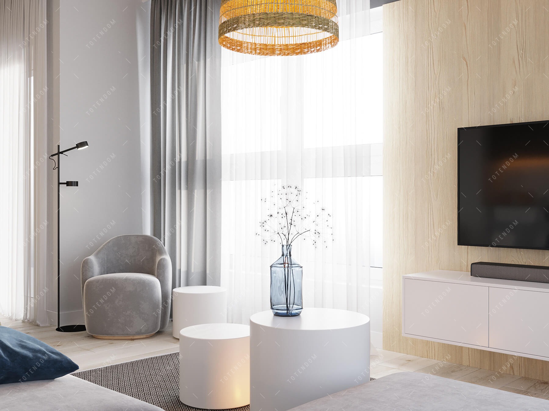 Wizualizacja salonu o stonowanej kolorystyce, która tworzy spokojną i harmonijną atmosferę. Ratanowa lampa dodaje naturalnego uroku i delikatnego światła. Ciemny stół stanowi eleganckie centrum przestrzeni, tworząc miejsce do spotkań, a eleganckie krzesła podkreślają wyrafinowany styl salonu. Beżowa kanapa zapewnia komfortowy punkt odpoczynku. To wnętrze emanuje spokojem, elegancją i subtelnością, tworząc idealne miejsce do relaksu i spotkań.